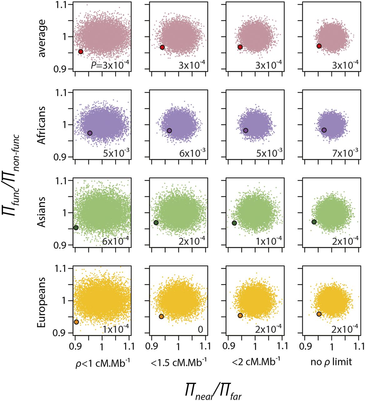 Combined near-vs-far and functional-vs-nonfunctional tests. Clouds of small dots represent the ratios πnear/πfar and πfunc/πnon-func obtained with the randomization test. The larger dot in each graph represents the observed πnear/πfar and πfunc/πnon-func. The numerical values at the lower right of each graph are the P-values obtained after 10,000 iterations of the randomization test. The P-values are estimated as the proportion of the randomizations that give values below the observed value in both tests.
