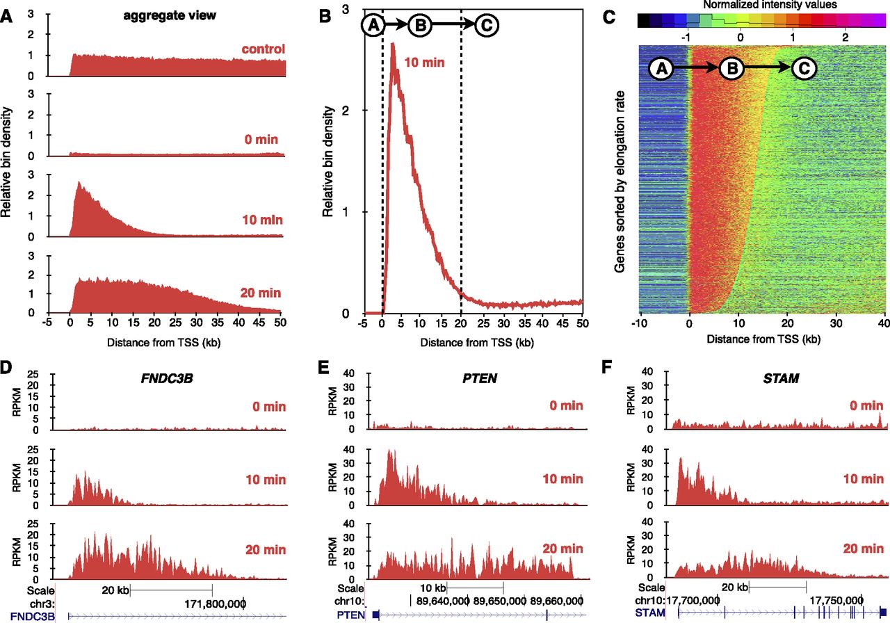 Transcription elongation rates measured genome-wide using BruDRB-seq. (A) Aggregate view of nascent RNA reads through the first 50 kb of large expressed genes in the human fibroblast cell line HF1. (Control) Bru labeling for 30 min. (0 min) Bru labeling during the last 10 min of a 60-min DRB treatment. (10 min) Appearance of a nascent transcription wave at the 5′ end of genes during a 10-min recovery after DRB removal (10-min Bru labeling during recovery period). (20 min) Advancing nascent transcription wave after a 20-min recovery time following DRB removal (Bru labeling during last 10 min of recovery). (B) Aggregate view of BruDRB-seq (10-min recovery) showing the upstream region of TSS having a low signal (A), advancing wave (B), and region downstream from the advancing wave with low signal (C). (C) A hidden Markov model was developed to identify advancing waves and measure their lengths, which are proportional to their elongation rates, having A, B, and C represent the three states of this model. Normalized signals of genes in HF1 cells ordered by elongation rate for a 10-min recovery following DRB removal are shown. Examples of transcriptional recovery in individual genes after 0-, 10-, and 20-min recovery after DRB removal in HF1 cells are shown in (D), (E), and (F).