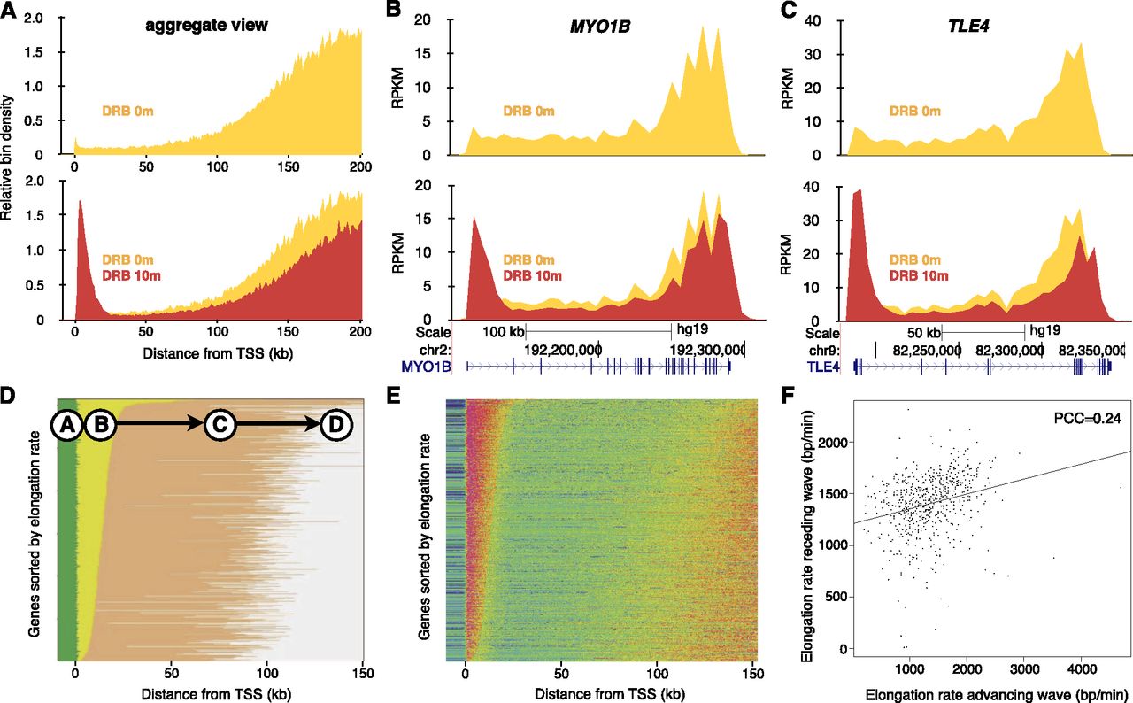 The relationship between advancing and receding transcription elongation waves. (A) Aggregate view of 189 genes longer than 200 kb in HF1 cells during DRB treatment (yellow) or following a 10-min recovery period after DRB treatment (red). Advancing and receding transcription waves in the large genes MYO1B (B) and TLE4 (C). (D) A four-state hidden Markov model was developed to take into account this receding wave in large genes. Genes in HF1 cells were ordered by the length of the advancing wave (state B) and pseudocolored by state (green, A; yellow, B; orange, C; gray, D). (E) Normalized signaling for genes ordered according to the length of state B. (F) The relationship between elongation rates calculated by the length of the advancing wave (state B) and the distance of the trough between the end of the advancing wave and the beginning of the receding wave (state C). (PCC) Pearson’s correlation coefficient.