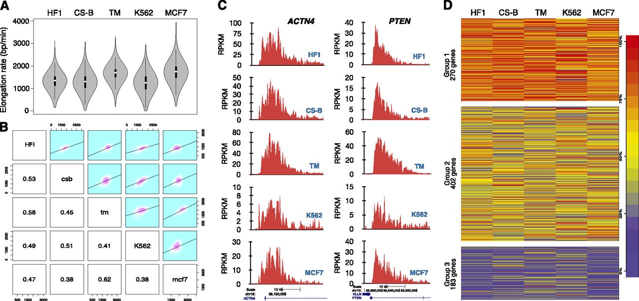 Comparisons of transcription elongation rates among five cell lines. (A) Cells were treated with DRB for 60 min followed by drug reversal and immediate incubation with 2 mM Bru for 10 min. BruDRB-seq was then performed and violin plots illustrating the distribution of elongation rates in the indicated cell lines are shown (the interquartile ranges are represented by thick vertical bars and white dots indicate the median values). Sample sizes: (HF1) 2702; (CS-B) 1932; (TM) 2469; (K562) 2270; (MCF-7) 2399. (B) Grid of pairwise comparisons of elongation rates between each of five cell lines. Each individual comparison includes those genes with measurable elongation rates that are expressed in both cell lines. Frequencies and linear regression models are plotted in the upper right panels and respective Pearson’s correlation coefficients in the lower left. (C) Examples of two individual genes showing similar elongation rates in the five cell lines. (D) Genes expressed in all five cell lines (855 genes) were clustered by normalized elongation rate into three groups using the k-medoids method. Genes in Group 1 tend to be faster-elongating in multiple cell lines, and genes in Group 3 tend to be slower in multiple cells. Genes belonging to Group 2 (47% of total genes) consist of genes with intermediate or variable elongation rates across cell lines. Genes are colored by percentile ranking within each cell line (100% is highest elongation rate [red]). (HF1) Human foreskin fibroblasts; (CS-B) Cockayne syndrome fibroblasts B; (TM) human skin fibroblasts; (K562) myelogenous leukemia; (MCF-7) breast cancer.