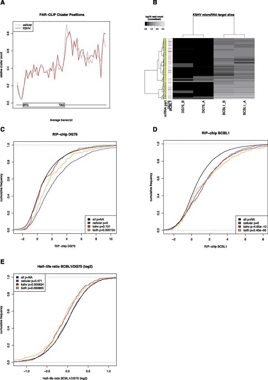 Validation of PAR-CLIP experiments. (A) The distribution of relative positions of target sites on mRNAs is shown. The x-axis represents the average length of 5′ untranslated regions (5′UTR), the coding regions (CDS), and the 3′ untranslated regions of all transcripts with at least one PAR-CLIP cluster. Each transcript was divided into 60 bins, and the relative frequency of target sites falling into each bin is shown on the y-axis. The data clearly illustrate the preferences of target sites in the 3′UTR as compared to CDS and 5′UTR. Viral microRNAs have the same preferences as cellular microRNAs. (B) The normalized number of reads in each cluster (rows) for each of the independent PAR-CLIP experiments (columns) is shown for KSHV microRNA target sites in the four PAR-CLIP libraries. KSHV-negative cell lines (columns 1 and 2) almost exclusively have no reads, whereas for KSHV-positive cell lines, dozens to hundreds of reads are observed per target site. Replicates are highly correlated, indicating high reproducibility. The additional annotations on the left side indicate the part of the transcript where a cluster is located (orange, 5′-UTR; yellow, coding; green, 3′-UTR; gray, not located on known mRNA) and the expression of the transcript in all experiments (red, at least twofold lower expression than the mean expression value for this transcript across all experiments; light red, at least 1.4-fold lower expression than the mean; light blue, at least 1.4-fold higher expression; blue, at least twofold higher expression). We also visualized and inspected individual target sites (Supplemental Fig. S1). (C,D) The log2 RIP-chip enrichment distributions of mRNAs only containing target sites of cellular microRNAs, only containing KSHV microRNA target sites, and containing target sites from both cellular and KSHV microRNAs in the uninfected cell line DG75 and the KSHV positive cell line BCBL1, respectively. KSHV targets are enriched in BCBL1 but not in DG75. (E) The mRNA half-life ratios are shown for the same sets of genes as in C and D. The half-life of mRNAs with KSHV target sites is significantly reduced in BCBL1.
