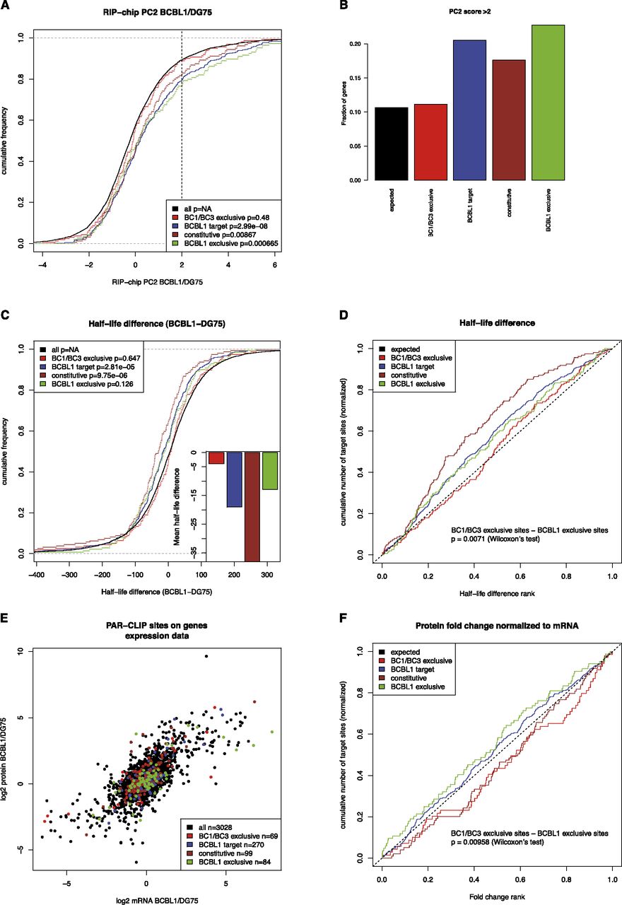 PAR-CLIP targets in RIP-chip experiments, mRNA half-life measurements, and expression measurements. (A) Differential RIP-chip enrichment scores (PC2 scores; positive values indicate higher enrichment in BCBL1 than in DG75). Generally, KSHV microRNA targets active in BCBL1 are significantly shifted toward higher values as compared to all other genes with any PAR-CLIP target site, in contrast to KSHV target sites exclusively active in BC1 or BC3 and not in BCBL1. B illustrates this further: The enrichment of genes with any KSHV site, with a constitutive or a BCBL1 exclusive site over genes with BC1/BC3 exclusive sites among all genes with PC2 score > 2 is about twofold in all cases. (C) Distributions of half-life differences between BCBL1 and DG75 for all genes with PAR-CLIP target sites. Thus, positive values indicate a longer mRNA half-life in BCBL1 than in DG75. Genes with KSHV microRNA targets active in BCBL1 tend to have shorter half-lives in BCBL1 than in DG75. This is highly significant for all BCBL1 target genes as well as the constitutive targets but not for BCBL1-specific targets, even if their half-life is on average ∼20 min shorter in BCBL1 than in DG75. However, KSHV microRNA targets that are inactive in BCBL1 do not show any shift in their half-lives. (D) The difference between targets active exclusively in BCBL1 is statistically significantly different from targets active exclusively in BC1 or BC3, when their ranks among all PAR-CLIP targets are considered. (E) Genes are scattered according to their mRNA log2 fold changes between BCBL1 and DG75 on the x-axis and to their protein log2 fold changes on the y-axis. In both dimensions, none of the KSHV target sets is significantly down-regulated on either the mRNA or protein level (Supplemental Fig. S5). However, target sites active in BCBL1 appear to be shifted toward the bottom right. These sites correspond to genes whose protein level fold change between BCBL1 and DG75 is lower than expected from the mRNA level. (F) The ranks of protein fold changes normalized to their mRNA levels for all gene sets considered. Normalized protein fold changes are significantly lower for genes with BCBL1-specific target sites than for genes with target sites inactive in BCBL1 (P < 0.01, Wilcoxon rank sum test) (see also Supplemental Fig. S3).
