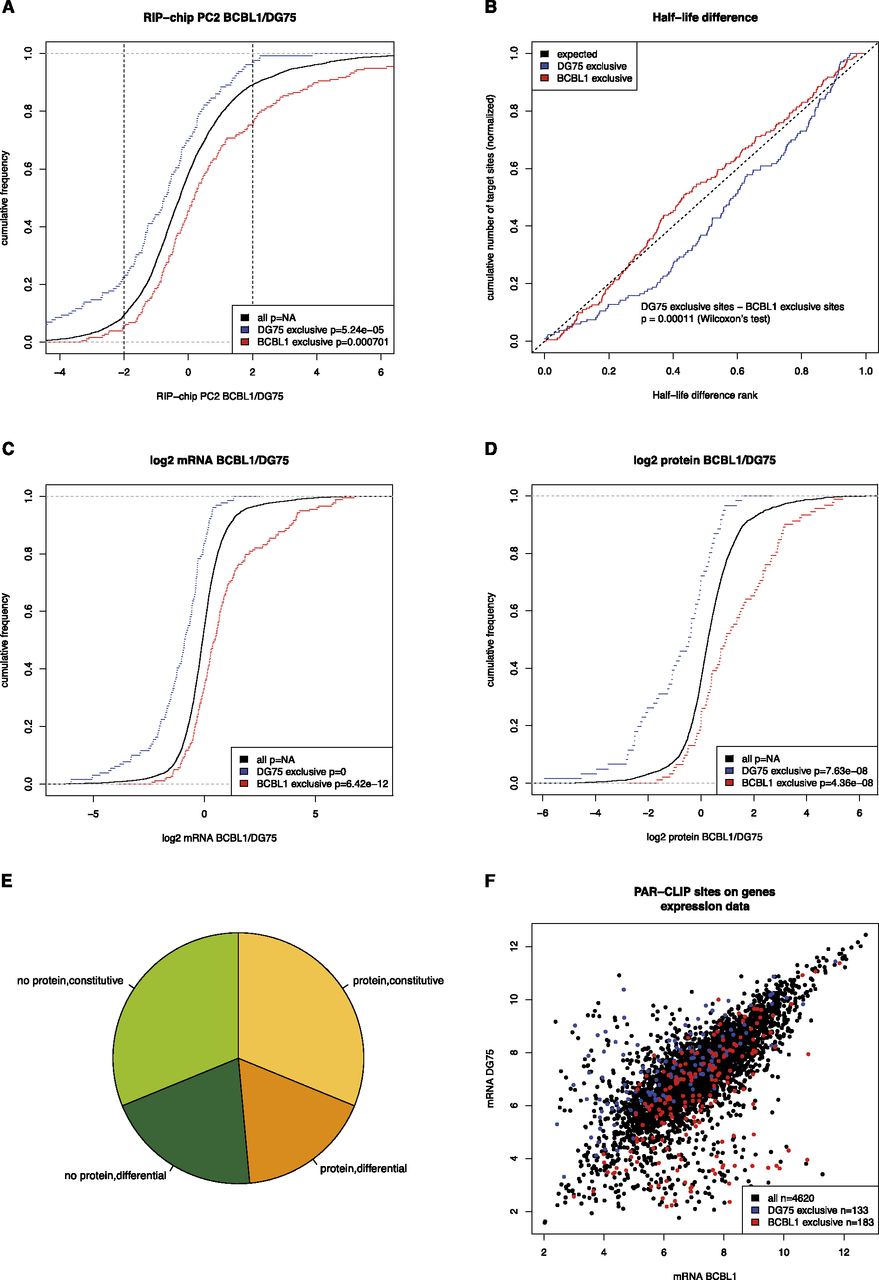 Analysis of context-dependent targets of cellular microRNAs. (A) Distributions of the differential RIP-chip scores as compared to all genes with any PAR-CLIP target sites (see also Fig. 3A). Both targets exclusively active in DG75 as well as in BCBL1 are significantly shifted toward stronger association with RISC in their respective context. The vertical lines indicate a threshold for strongly differentially RISC-associated genes. In both cases, the respective context-dependent targets are more than twofold enriched over the background genes (∼10% of background genes in comparison to >20% of the target genes in both cases). (B) The rank distribution of half-life differences for both sets of context-dependent targets is shown (see also Fig. 3D). BCBL1-specific targets are significantly shifted toward lower half-life difference ranks in comparison to DG75-specific targets indicative for effects of context-dependent microRNA/target interactions in the respective context only. (C,D) The distributions of mRNA and protein fold changes between BCBL1 and DG75 for context-dependent targets of cellular microRNAs, respectively, as compared to the background of all genes with any PAR-CLIP target site. Clearly, based on mRNA as well as on protein levels, context-dependent targets are more highly expressed in their target context. This indicates that the target mRNA expression directly contributes to the cellular context of microRNA-mediated regulation. (E) Depiction of how many genes with context-dependent target sites (n = 311) are constitutively (less than twofold) expressed in both cell lines on an mRNA level and have a protein detected in both cell lines (n = 97), how many are differentially expressed but with a detected protein (n = 54), how many do not have a protein and are differential (n = 63), and how many without a detected protein are constitutive (n = 97). (F) Scatterplot of the microarray intensity measurements for all genes with a PAR-CLIP target site. Interestingly, there seem to be subpopulations of target genes that have extremely low expression values in one of the two contexts and high intensities in the other, where respective target sites are exclusively active. These may indeed correspond to not expressed genes in their inactive target context (see also Supplemental Fig. S4).