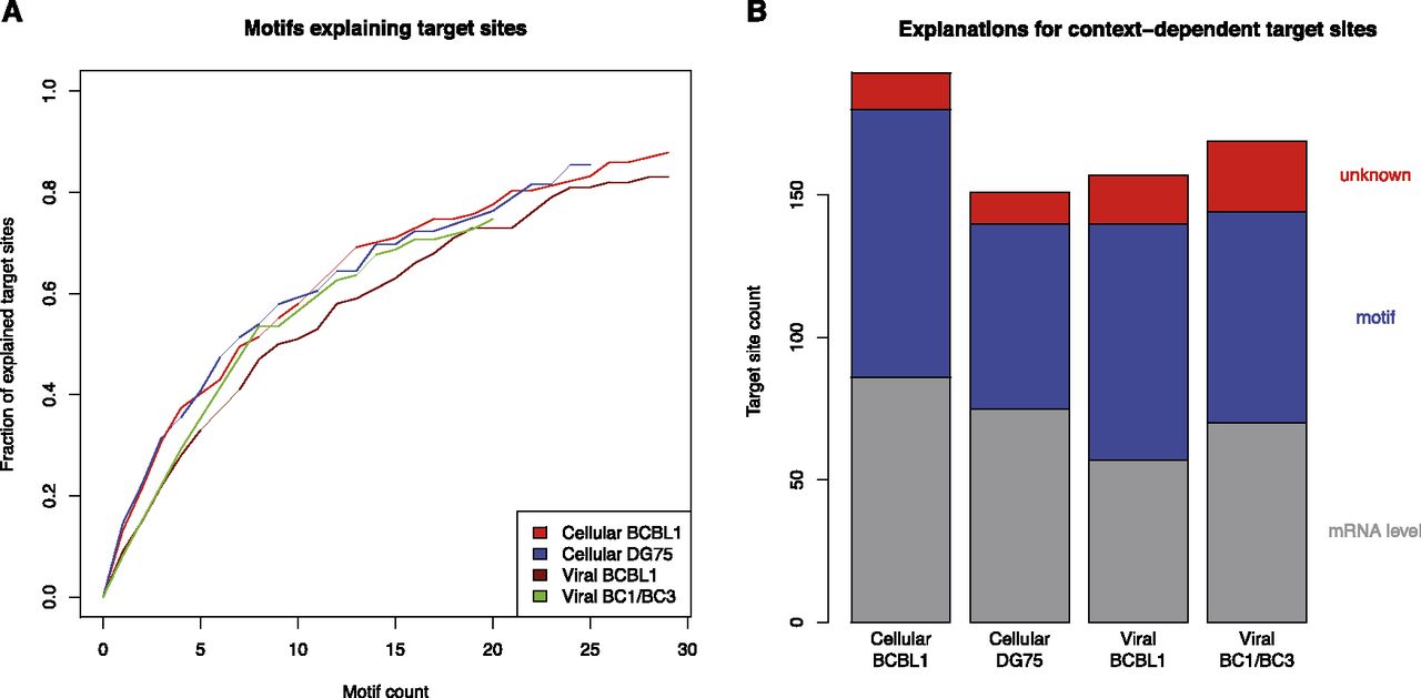 Role of sequence motifs for context-dependent target sites. (A) The fraction of context-dependent target sites that contain a certain number of discriminative k-mers. Only target sites that cannot be explained by mRNA levels were used. A k-mer is discriminative if it occurs n times in the positive set (e.g., cellular BCBL1-exclusive sites in red) and does not occur in the corresponding negative set (e.g., cellular DG75-exclusive sites) (see Table 1). We sorted discriminative k-mers according to their number of occurrences in decreasing order and chose a cutoff for n based on our randomization experiments (Supplemental Fig. S6; Supplemental Table S3). In all cases, between 75% and 90% of all context-dependent target sites can be explained by a discriminative k-mer. (B) Putative explanations for the full sets of context-dependent target sites are illustrated. On average, >90% can be explained by either differential mRNA levels or the presence of a discriminative k-mer.