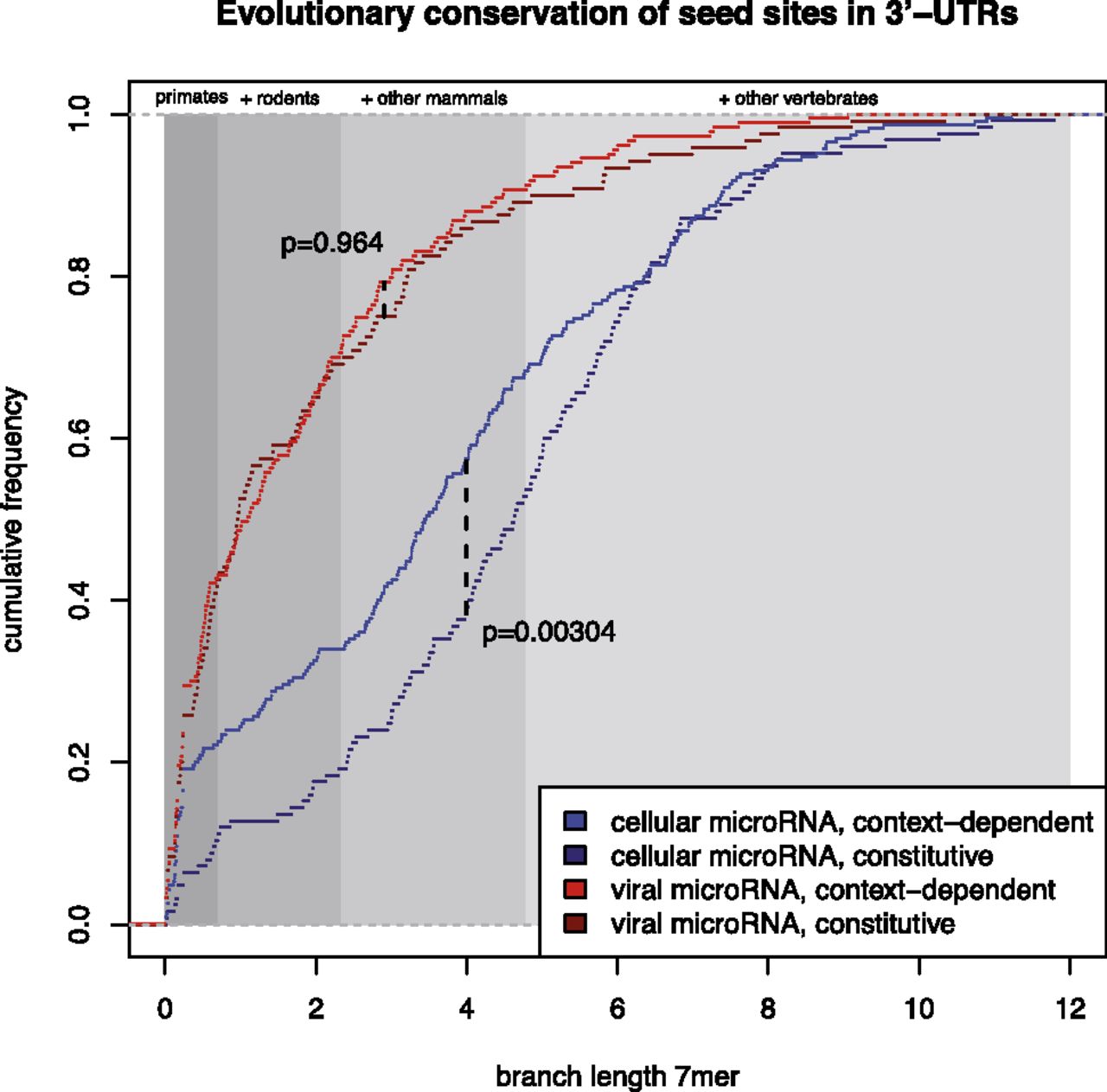 Conservation of target sites. Distributions of branch lengths of target sites are illustrated (see main text for a definition of branch lengths). Shaded regions indicate the maximal branch lengths of target sites conserved in primates, in primates and rodents, in mammals, and in vertebrates. All cellular microRNAs considered here are conserved in vertebrates. Constitutive target sites of these microRNAs are significantly more conserved (P < 0.00304, two-sided Kolmogorov-Smirnov test) than context-dependent target sites. Moreover, neither context-dependent nor constitutive target sites of viral microRNAs show evidence for evolutionary conservation (see also Supplemental Fig. S7).