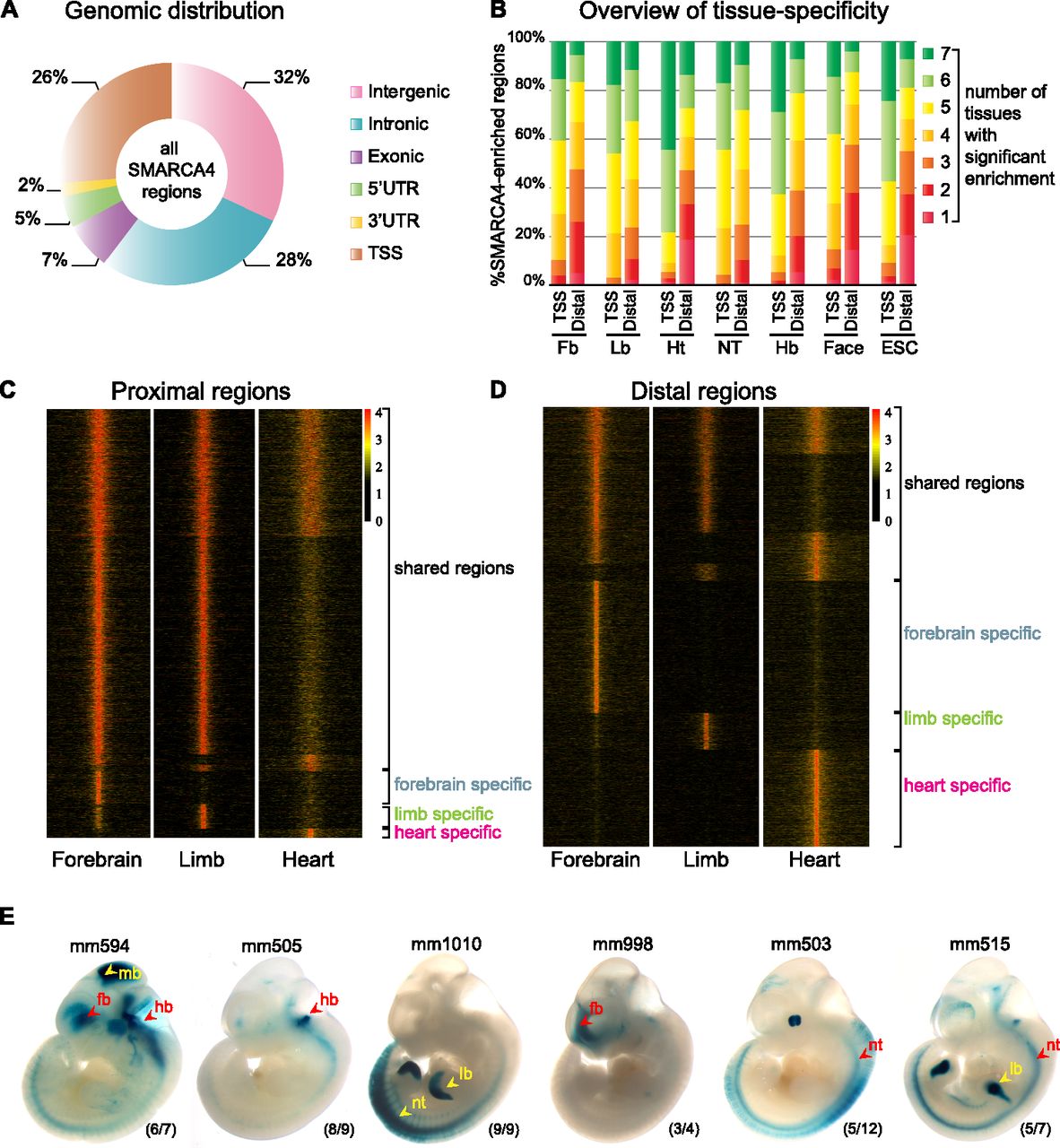 ChIP-seq identifies SMARCA4-enriched regions genome-wide. (A) Genomic distribution of SMARCA4-enriched regions. (B) Tissue-specific SMARCA4 enrichment in TSS versus distal regions in each data set. The bar graph illustrates the lower percentage of tissue-specific SMARCA4-bound regions among the proximal sites (TSS) versus distal sites by indicating the number of tissues in which a specific SMARCA4 region is significantly enriched (red, present in one tissue; dark green, present in seven tissues). (C,D) Heatmaps displaying SMARCA4 coverage across three tissues (forebrain, limb, and heart). Each row of heatmap represents one enhancer, with coverage plotted across the 10 kb surrounding enrichment peak. (C) SMARCA4 enrichment proximal to TSSs. (D) SMARCA4 enrichment at distal regions. (E) Selection of six reproducible SMARCA4-bound enhancers at E11.5, illustrating SMARCA4 activity across different tissues. Reproducible predicted patterns are indicated by red arrows while unpredicted reproducible tissue-specific activity is indicated by yellow arrows. (Fb) Forebrain; (Mb) midbrain; (Hb) hindbrain; (Nt) neural-tube; (Lb) limbs; (Ht) heart. The reproducibility of the indicated patterns is indicated for each embryo (number of observed/total number of embryos).