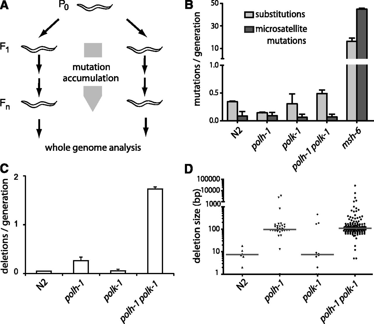 Spontaneous mutagenesis in TLS-deficient strains. (A) Generation of mutation accumulation (MA) lines. For each genotype, multiple populations were started by cloning out single worms from a single hermaphrodite P0. Cultures were propagated by transferring animals to new plates each generation. At generation Fn, a single animal was grown to a full population, from which genomic DNA was isolated and subjected to whole-genome sequencing on an Illumina HiSeq. (B) Substitution and microsatellite mutation rates for the indicated genotypes. Mutation rates are expressed as the number of mutations per generation divided by the fraction of the genome covered >3 times in all samples. (C) Rates of structural variations for the indicated genotypes. (D) Size distribution of deletions in the different mutant backgrounds. The median sizes are indicated by the gray horizontal lines.
