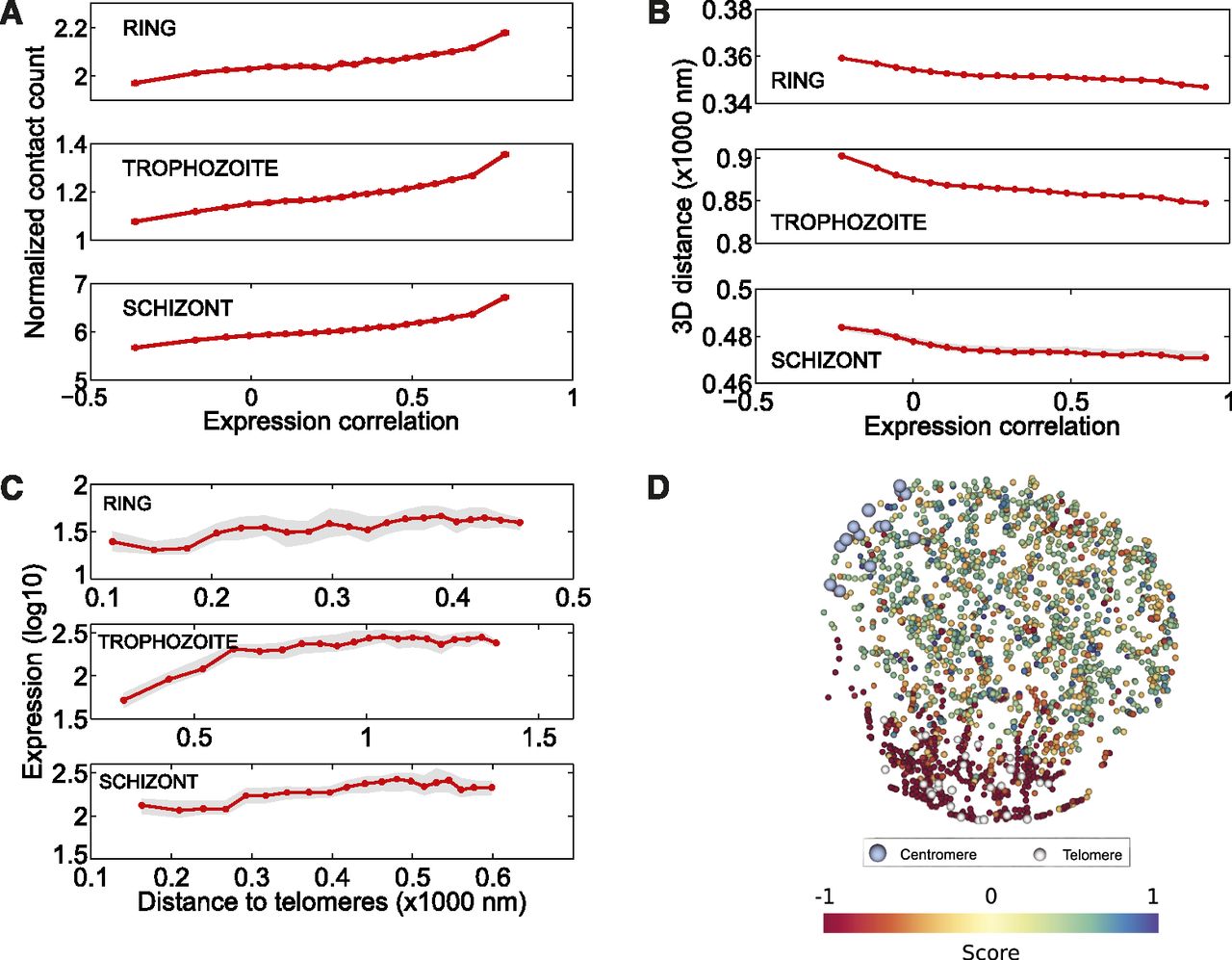 Relationship between 3D architecture and gene expression. (A) Correlation between expression profiles of pairs of interchromosomal genes as a function of number of contacts linking the two genes. To generate this plot, all interchromosomal gene pairs are first sorted in increasing order of their expression correlation and then binned into 20 equal width quantiles (fifth, 10th, …, 100th). For each bin, the average expression correlation between gene pairs (x-axis) and the average normalized contact count linking the genes in each pair together with its standard error (y-axis) are computed and plotted. Interchromosomal gene pairs that have contact counts within the top 20% for each stage have more highly correlated expression profiles than the remaining gene pairs (Wilcoxon rank-sum test, P-values 2.48 × 10−206 [ring], 0 [trophozoite], and 0 [schizont]). (B) Correlation between expression profiles of pairs of interchromosomal genes as a function of 3D distance between the genes. This plot is generated similarly to A but using 3D distances instead of contact counts (y-axis). In order to summarize results from multiple 3D structures per each stage, we plot the median value among 100 structures with a red line and shade the region corresponding to the interval between the fifth and 95th percentile with gray. Interchromosomal gene pairs closer than 20% of the nuclear diameter have more highly correlated expression profiles than genes that are far apart (Wilcoxon rank-sum test, P-values 7.17 × 10−221 [ring], 0 [trophozoite], and 1.57 × 10−88 [schizont]). (C) Gene expression as a function of distance to telomeres. To generate this plot all genes are first sorted by increasing distance to the centroid of telomeres (x-axis) and then binned similar to A into 20 equal width quantiles. The average log expression value (Bunnik et al. 2013) together with its standard error (y-axis) is plotted for genes in each bin. In order to summarize results from multiple 3D structures per each stage, we plot the median value among 100 structures with a red line and shade the region corresponding to the interval between fifth and 95th percentile with gray. Genes that lie within 20% of the nuclear diameter to the centroid of the telomeres showed significantly lower expression levels (Wilcoxon rank-sum test, P-values 1.54 × 10−12 [ring], 1.69 × 10−32 [trophozoite], 3.37 × 10−20 [schizont]). (D) First KCCA expression profile component score, corresponding to the projection of the gene expression profile onto the extracted KCCA profile for the trophozoite stage.