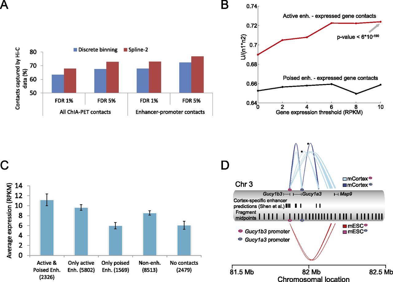 Fit-Hi-C identifies high-confidence contacts between previously predicted/validated enhancer-promoter pairs. (A) Percentage of RNAPII-mediated chromatin interactions identified by Zhang et al. (2013) in mouse ESCs that are captured either using our method (spline-2) or the discrete binning approach of Duan et al. (2010) from mESC Hi-C data at different FDR thresholds. A total of 1007 enhancer-promoter contacts and 2494 contacts between any two RNAPII binding peaks are extracted from Zhang et al. (2013) by limiting our analysis to mid-range contacts in the genomic distance interval of (50 kb, 5 Mb]. (B) Normalized Mann-Whitney U statistics for predicted locus pairs sorted by statistical significance, where “positive” pairs link an active enhancer (red line) or a poised enhancer (black line) to a gene expressed at least at the level given on the x-axis. The P-value of the Mann-Whitney test is shown for rejecting the null hypothesis that highly expressed genes (RPKM > 10) are not linked to active enhancers by Fit-Hi-C with Q-values lower than chance. (C) Average expression values and their standard errors for five nonoverlapping gene groups for the hESC cell line. The first three groups are defined according to the presence of contacts at FDR 1% from gene promoters to either or both active and poised enhancers. The remaining genes (i.e., genes with no contacts at FDR 1% to any annotated enhancer) are further segregated into two groups depending on whether their promoters have at least one contact at FDR 10% to some loci (“Non-enh”) or no contacts to any loci even at FDR 10% (“No contacts”). The first two groups of genes with at least one contact with an active enhancer show similar expression profiles regardless of the presence/absence of a contact with a poised enhancer (P-value of 0.92, two-sample Kolmogorov-Smirnov test). Genes that have a contact with an active enhancer show significantly higher expression compared to genes in all three groups that lack such contacts (P-values of 4 × 10−10, 0.0014, and 1.5 × 10−45 for “Only poised enh,” “Non-enh,” and “No contacts,” respectively). (D) Contact profiles at FDR 0.1% for promoter regions of two genes (Gucy1b3 and Gucy1a3) that show differential expression between two mouse cell lines (mESC and mCortex). Each connector represents a significant contact with thickness proportional to the minus log(P-value) of the contact. The connector colors indicated in square boxes are determined jointly by the cell line (mESC or mCortex) and by the gene promoter of interest (magenta oval for Gucy1b3, blue oval for Gucy1a3). No pink connectors are drawn from the promoter of Gucy1a3 due to the lack of significant contacts involving this promoter in mESCs. Cortex-specific enhancer elements predicted by Shen et al. (2012) and midpoints of each of the 10 consecutive restriction fragments are shown as two separate tracks. Contact confidences are assigned by Fit-Hi-C using ICE-corrected contact maps. A similar figure is also generated using raw contact maps (Supplemental Fig. 6).