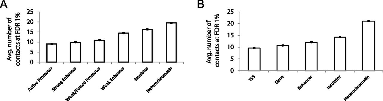 Insulators and heterochromatin regions participate in more high-confidence contacts than promoters and strong enhancers. Average number of high-confidence (FDR 1%) contacts and their standard errors identified by Fit-Hi-C for each annotation term from two different semiautomated genome annotation methods. Contact confidences are assigned at a resolution of 10 RE fragments for the Hi-C data from hESC cells (Dixon et al. 2012), using ICE-corrected contact maps and one-step refinement of the null model (spline-2). In order to map genome annotations to the windows used in the Fit-Hi-C analysis, each annotated region is assigned to the 10 RE fragment window with which it has the most overlap. (A) Six selected annotations from 15-label genomic segmentation of hESC using ChromHMM (Ernst and Kellis 2012). (B) Five selected annotations from 25-label genomic segmentation of hESC using Segway (Hoffman et al. 2012, 2013). See Supplemental Figure 9 for plots with complete lists of labels for both segmentation methods.