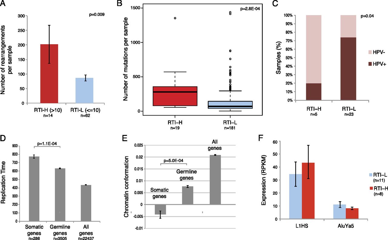 Retrotransposon load is correlated with genomic instability, late-replication, and closed chromatin. (A) Number of somatic rearrangements in LUSC, LUAD, and HNSC samples with high retrotransposon load (>10 somatic retrotransposon insertions, RTI-H) and with low retrotransposon load (≤10 somatic insertion, RTI-L). (B) Number of somatic mutations in RTI-H and RTI-L samples across all 11 tumor types. (C) HPV status of RTI-H and RTI-L HNSC samples. (D) Replication timing of genes that contain somatic retrotransposon insertions versus genes that contain germline insertions, and all RefSeq genes. Later replicating genes have higher values of replication time on the y-axis. (E) Chromatin conformation of genes that contain somatic retrotransposon insertions versus genes that contain germline insertions, and all RefSeq genes. The y-scale represents relative chromatin “openness,” the lower the y-value, the more closed the chromatin state. (F) Expression (RPKM) of consensus L1HS and AluYa5 sequences in RTI-H and RTI-L LUSC samples. All error bars represent standard error of the distribution.