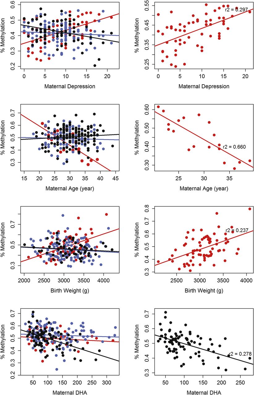 Association of methylation with environment in one genotypic group. Examples of VMR-CpGs whose methylation levels are significantly associated with phenotype in only one genotypic group. Phenotypic values are shown on the x-axis, and methylation value in percentages on the y-axis. (Left) Data for all samples. Samples are colored by their genotypic group (red indicates AA; blue, AB; black, BB), and a straight fit line is fitted for each group. (Right) Genotypic subgroup with the highest R2.