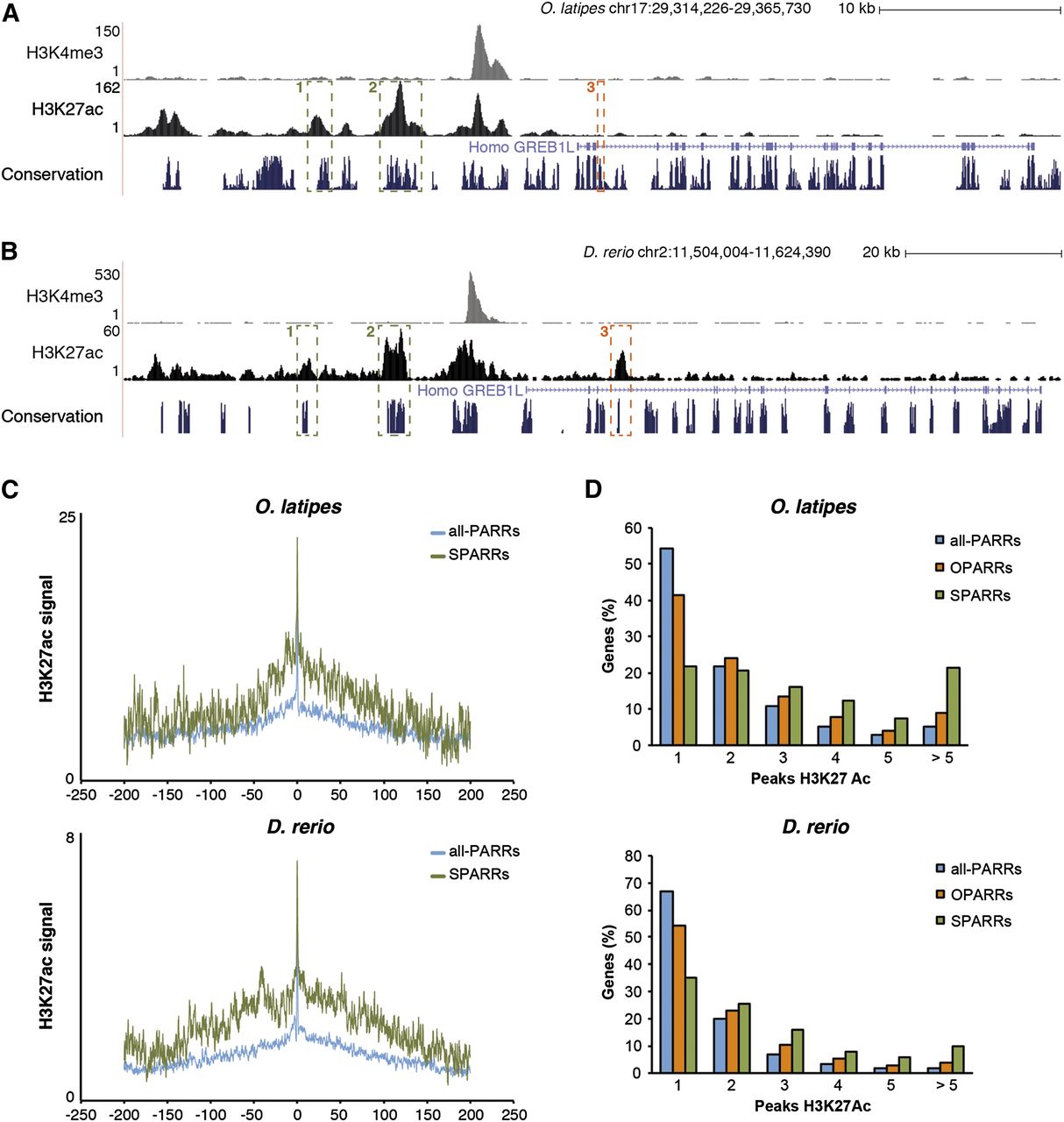 Analysis of the regulatory landscape of phylotypic genes associated with SPARRs and OPARRs. (A,B) Two examples of SPARR (1, 2) and one of OPARR (3) in the medaka genome (A) and their orthologous regions in zebrafish (B) are shown. (C) Average profiles of H3K27ac signal covering a 400-kb landscape for genes associated with all-PARRs (blue line) and SPARRs (green line) in both species: medaka and zebrafish (upper and lower panels, respectively). The average of reads in each bin of 200 bp is represented in log scale on the x-axis. The y-axis shows the position around the gene TSS, in kb. (D) Frequency distribution of orthologous genes (in percent) associated with either all H3K27ac peaks (all-PARRs), OPARRs, or SPARRs, according to the number of H3K27ac regulatory regions included in their vicinity; medaka and zebrafish (upper and lower panels, respectively).