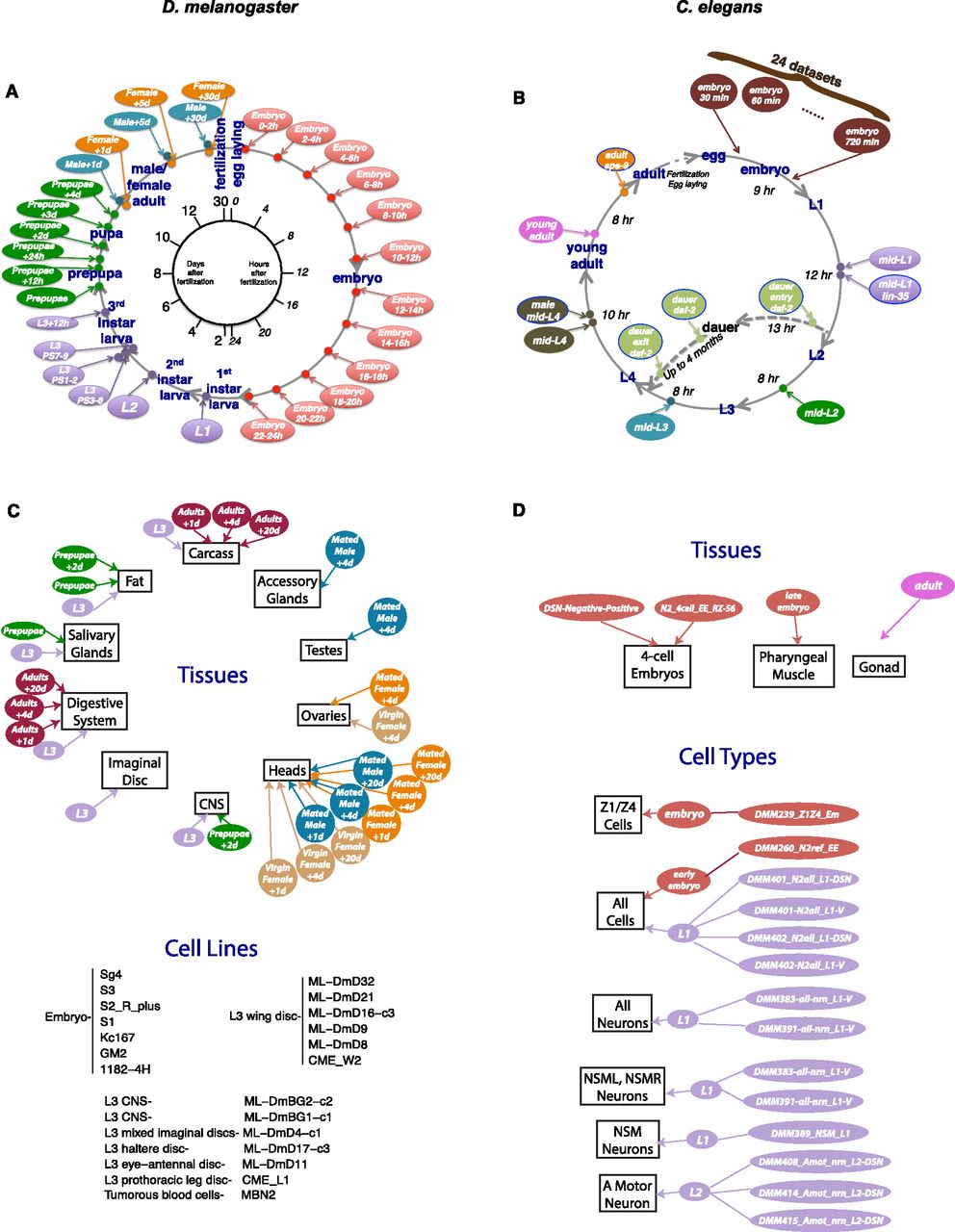 Life cycles and modENCODE RNA-seq data sets of D. melanogaster and C. elegans (Gerstein et al. 2014). (A) modENCODE RNA-seq data sets of 30 different D. melanogaster developmental stages. (B) modENCODE RNA-seq data sets of 35 different C. elegans developmental stages. (C) modENCODE RNA-seq data sets of 29 tissues and 19 cell lines in D. melanogaster. (D) modENCODE RNA-seq data sets of four tissues and 14 dissected cells in C. elegans. For detailed information on the stage, tissue, and cell labels, please refer to Supplemental Table S2.