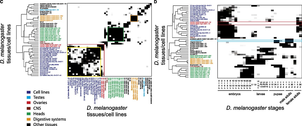 Comparison results of different developmental stages, tissues, and cell lines within D. melanogaster. More significant mapping scores are shown in darker color, corresponding to the scale showing –log10 transformed Bonferroni corrected P-values, which are calculated from the hypergeometric test in Figure 2A. (A) Stage comparison result. All are from mixed organisms with the exception that adults are separated into male and female that have the same three developmental time points (1, 5, and 30 d after eclosion). (B) Comparison of developmental stages with the three gene categories (maternal, maternal/zygotic, and zygotic) defined in Lott et al. (2011). (C) Tissue/cell line comparison result. The grouping of cell lines (yellow box), the mapping of cell lines and ovary tissues (red box), the grouping of head tissues (green box), and the grouping of digestive system tissues (orange box) are highlighted. (D) Comparison of developmental stages with tissues/cell lines, in which the red box marks the mapping of ovary tissues to early embryonic and female adult stages, and the cyan box marks the mapping of testes tissues to pupa and male adult stages. Hierarchical clustering was applied to order the tissues/cell lines in C and D. Tissues from similar organs and cell lines are marked with colors. For detailed information on the stage, tissue, and cell labels, please refer to Supplemental Table S2. Mapping score as in A and B.