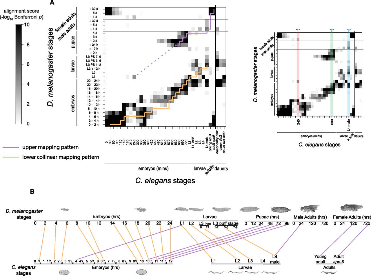 Comparison results of different developmental stages between D. melanogaster and C. elegans. Mapping scores shown in the heatmaps are –log10 Bonferroni corrected P-values, which are calculated from the hypergeometric test in Figure 2B. (A) Overall comparison of stages between species. The orange and purple stair-step lines were found by maximizing the sum of mapping scores of the stage pairs they pass through, to emphasize the two parallel collinear mapping patterns observed between D. melanogaster and C. elegans developmental stages. The red, green, and cyan shades mark the three two-to-one fly-worm stage mapping columns 1, 2, and 3 (inset, right). (B) A cartoon summary of main comparison results. Every orange or purple line corresponds to an upper-left corner in the stair-step line of the same color in A. For detailed information on the stage labels, please refer to Supplemental Table S2. (The stage images were modified with permission from FlyMove [Weigmann et al. 2003] by Dr. Christian Klämbt and from WormAtlas [http://www.wormatlas.org] by Dr. David H. Hall and Dr. Zeynep F. Altun.)