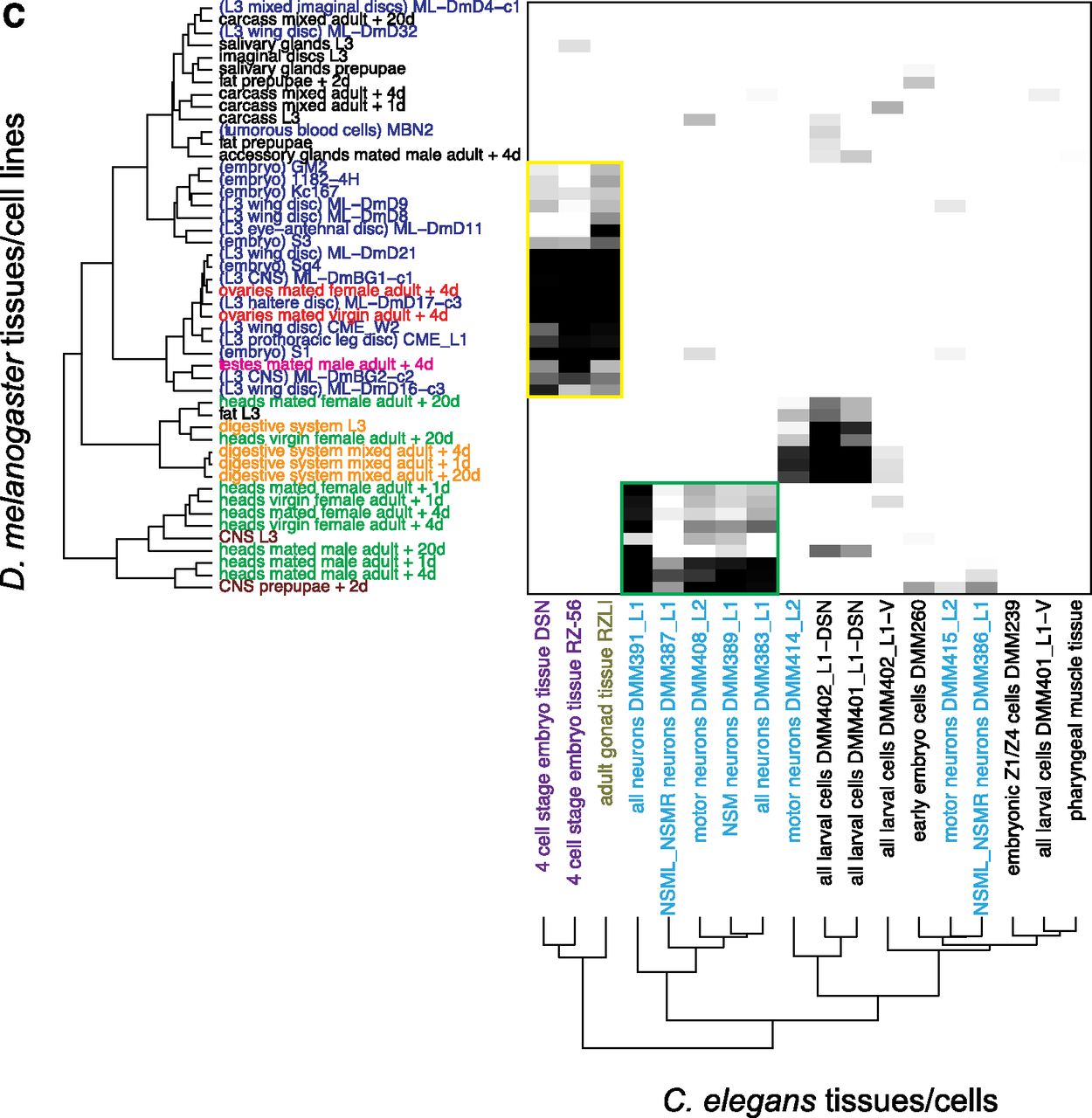 Comparison results of different developmental stages, tissues, cell lines, and dissected cells between D. melanogaster and C. elegans. Mapping scores shown in the heatmaps are –log10 transformed Bonferroni corrected P-values, which are calculated from the hypergeometric test in Figure 2B. (A) Comparison between D. melanogaster developmental stages and C. elegans tissues/dissected cells. (B) Comparison between D. melanogaster tissues/cell lines and C. elegans developmental stages. (C) Comparison between D. melanogaster tissues/cell lines and C. elegans tissues/dissected cells. Hierarchical clustering was applied to order the D. melanogaster tissues/cell lines and C. elegans tissues/dissected cells in A, B, and C. Tissues/dissected cells with similar origins and cell lines are marked with colors. For detailed information on the stage/tissue/cell labels, please refer to Supplemental Table S2.