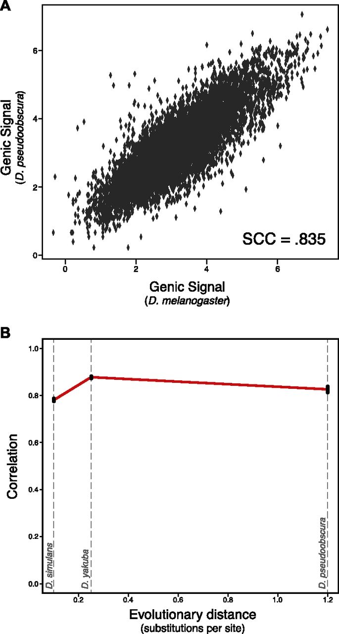 Strong conservation of H3K27me3 in Drosophila orthologs. (A) Example graph of orthologous gene conservation for the comparison of melanogaster to pseudoobscura. Each dot is a single-copy orthologous gene pair, and the position on the x-axis represents the log melanogaster genic signal (see Methods), while the y-axis represents the log pseudoobscura genic signal; each is the mean of two experiments. The overall rank correlation coefficient between species is 0.835. (B) Overall trend of single-copy ortholog conservation within Drosophila. Each point is the Spearman rank correlation of one pairwise between-species comparison, plotted against the evolutionary distance from Drosophila melanogaster (in substitutions per neutral site). Black bars represent bootstrapped 95% confidence intervals. From left to right the species are D. simulans (SCC = 0.781), D. yakuba (SCC = 0.878), and D. pseudoobscura (SCC = 0.835).