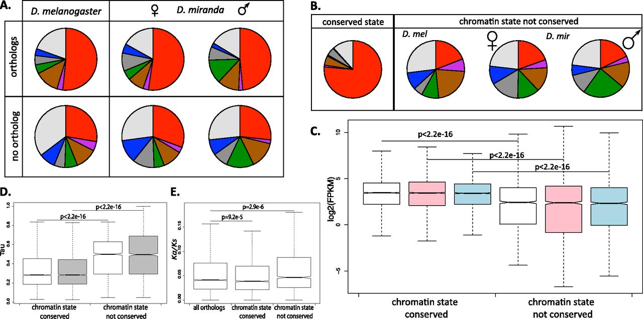 Conservation of chromatin states of genes in D. miranda and D. melanogaster. (A) Chromatin state of orthologous and nonorthologous genes in D. miranda females and males and D. melanogaster. Orthologous genes defined by FlyBase. (B) Chromatin states of orthologous genes whose state is conserved across species and sexes (left), and those whose state is not conserved (right). (C) Expression levels (log2[FPKM]) of orthologous genes with conserved and not conserved chromatin state (D. melanogaster in white, D. miranda males in blue, D. miranda females in pink). (D) Tissue specificity (measured by the tissue-specificity index tau) of genes with conserved and not conserved chromatin state in D. melanogaster (white) and D. miranda (gray). (E) Rates of protein evolution (Ka/Ks) of genes with conserved and not conserved chromatin state between D. melanogaster and D. miranda.