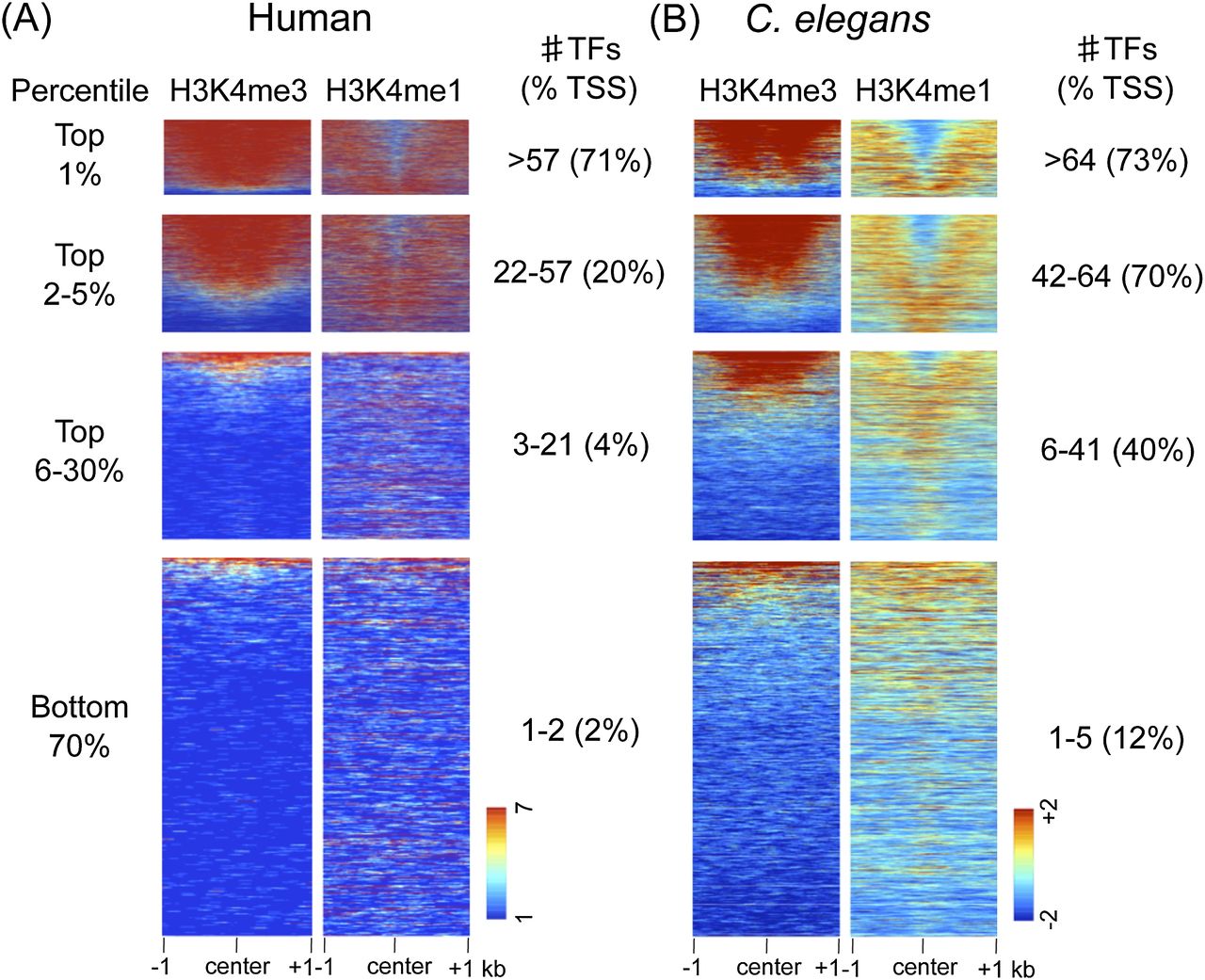 HOT regions display promoter features. H3K4me3 and H3K4me1 signals plotted at the centers of core TF overlap regions ranked by the indicated percentile of TF occupancy in humans and C. elegans. (A) For human TF overlap regions, 7419 (top 1%), 30, 945 (top 2%–5%), a random selection of 100,000 of 241,975 (top 6%–30%), and 456,812 (bottom 70%) regions are plotted. (B) For C. elegans TF overlap regions, 376 (top 1%), 1429 (top 2%–5%), 9721 (top 6%–30%), and 23,536 (bottom 70%) regions are plotted. In each TF overlap band, the number of TFs and the percentage of TF core midpoints ±500 bp of a TSS are indicated. Scales show linear (human) or log2 (C. elegans) input normalized signal ranges.