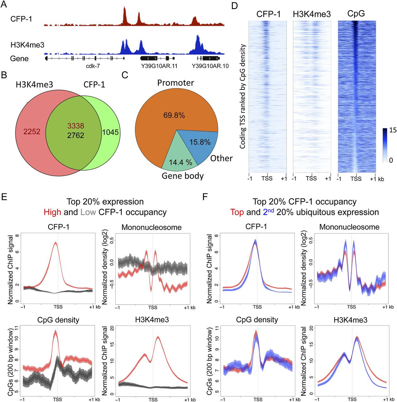 C. elegans CFP-1 is targeted to CpG-rich promoters marked by H3K4me3. (A) A representative screen shot for the distribution of CFP-1 (red) and H3K4me3 (blue) normalized ChIP signals in late embryos. (B) Venn diagram showing the overlap between CFP-1 and H3K4me3 ChIP ChIP-seq peaks. Numbers in the overlap region are not equal because single peaks in one data set may overlap more than one peak in the other data set. (C) Percentage of CFP-1 peaks overlapping promoter regions (orange; ±500 bp of coding TSSs) (Chen et al. 2013; Kruesi et al. 2013), gene bodies (green), and the remaining genomic regions (blue). (D) Signal distributions for CFP-1, H3K4me3, and CpG density plotted in 2-kb windows centered by coding TSSs identified in Chen et al. (2013) in heat maps ranked by the density of promoter CpGs. The color scheme shows the scale (0–15) for the indicated signal. (E) Plots of CFP-1 ChIP signal, CpG content, mononucleosome pattern, and H3K4me3 signal across promoters of active ubiquitous genes in the top 20% of expression with high (red, top 20%), or low (dark gray, bottom 20%) CFP-1 occupancy. (F) Plots of CFP-1 ChIP signal, CpG content, mononucleosome pattern, and H3K4me3 ChIP signal across ubiquitous promoters highly targeted by CFP-1 (top 20%) and with high (red, top 20%) or low (blue, second 20%) expression levels. All plots display the indicated features in 2-kb windows centered at TSSs. Lines show mean signal, darker filled areas show standard error, and lighter filled areas are 95% confidence intervals.