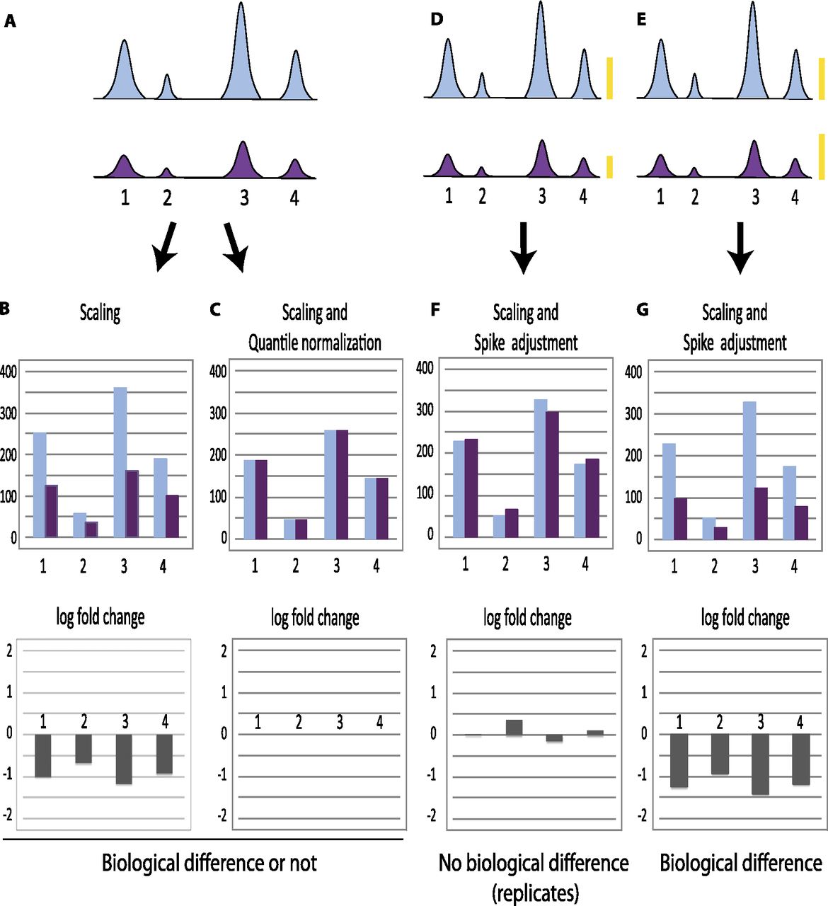 Normalization can obscure global effects. (A) Schematic representation of peaks obtained after ChIP-seq in a hypothetical example where all peaks are uniformly diminished in the second (purple) sample compared with the first (light blue). These samples can represent a replicate experiment, in which case the overall decrease observed in the second sample is the result of experimental variation, or they can represent experiments performed with samples collected under different conditions, in which case the global decrease might reflect a biological difference. No spike chromatin is included. (B) Normalization by scaling to total number of tags aligned onto the genome (i.e., normalization for sequencing depth) showing tag counts (top) and log2 fold change (bottom). In this hypothetical example, the number of tags aligned onto the genome is quite similar in both samples, and this type of normalization indicates a general decrease for each peak in the second sample, whether the two samples are biologically different (and thus should indeed indicate a protein occupancy decrease in sample 2) or similar (and thus should in fact display similar signals). (C) Normalization by scaling followed by quantile normalization showing tag counts (top) and log2 fold change (bottom). In this example, the second step—quantile normalization—will equalize the sample distributions whether the samples are biologically different or not, because the decrease in sample 2 is uniform. In D and E, spike chromatin is included in the sample and gives rise to signals symbolized by the yellow bars. (F,G) Normalization by scaling followed by spike adjustment showing tag counts (top) and log2 fold change (bottom). In F, the spike adjustment factor increased the signals in sample 2 by a factor of about two, in G, the spike adjustment factor decreased the signal in sample 2 by a factor of about 0.8 (see yellow bars). Spike adjustment reveals whether the samples are in fact similar (example in F) or are in fact biologically different (example in G).