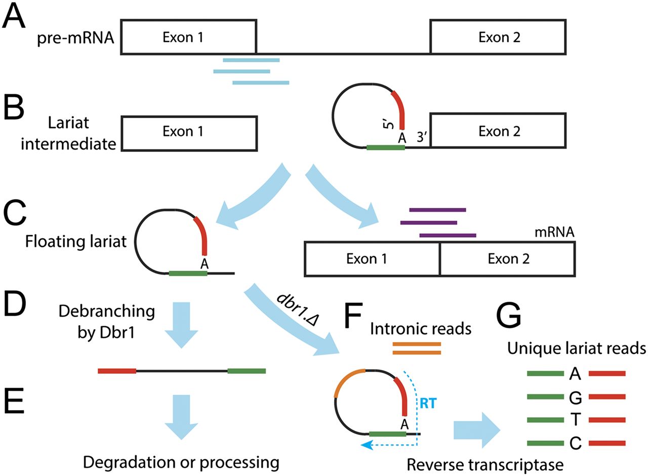 Scheme of intron splicing and diagnostic sequence reads. (A) Pre-mRNA with diagnostic exon-intron reads (cyan). (B) First transesterification reaction: lariat intermediate with phosphodiester bond between 5′ splice donor (red) and branch-point adenine (A) along with upstream sequence (green). (C) Final splicing reaction: exons are ligated yielding mature mRNA with diagnostic exon-exon junction reads (purple), while the lariat is excised. (D) Intron 3′ tail removal and debranching. (E) Rapid degradation or further processing. (F) In dbr1Δ cells, lariats become stabilized and accumulate, resulting in enhanced intronic sequence reads (orange). The reverse transcriptase also reads through the 2′–5′ linkage (hatched blue arrow). (G) This reverse transcription produces unique lariat reads, where the sequence upstream of the branch point (green) precedes the 5′ segment of the intron (red). The enzyme often mutates the branch-point adenine to any other nucleotide as illustrated. The accumulation of lariat structures would inevitably result in the production of additional intronic reads (orange) that enhance intronic expression level.