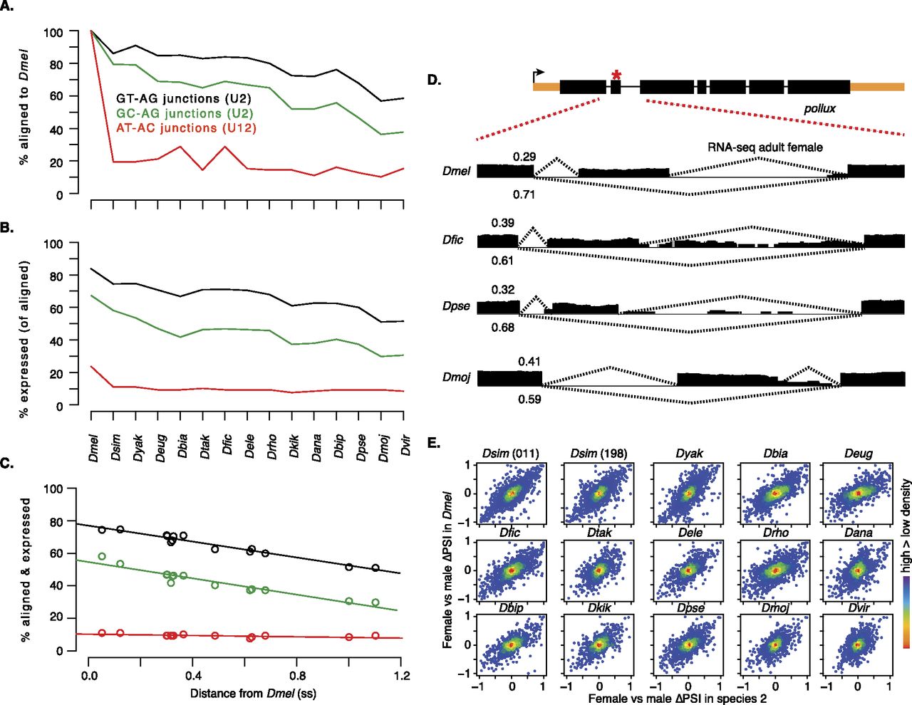RNA splicing validation. (A) D. melanogaster MDv2 GT-AG (black) and GC-AG (green) splice junctions (recognized by U2 spliceosomes) and AT-AC splice junctions (red) (recognized by U12 spliceosomes) that align to the indicated genomes. (B) Aligned elements expressed (≥1 junction spanning read). (C) Combined sequence and expression conservation for each element type plotted against distance from D. melanogaster. (D) An example of a validated splicing event in a transcript model of the pollux gene. (Upper panel) An exon previously annotated as constitutive is annotated as an alternatively spliced cassette in MDv2 (red asterisk). (Lower panels) RNA-seq read coverage (black), and junction coverage with percent spliced in (PSI) values for the cassette exon inclusion (upper dotted lines) and exclusion (lower dotted lines) isoforms in adult females of the indicated species. Additional species also showed this splicing pattern (not shown). (E) Density plots of female/male ▵PSI values for species (and two strains in the case of D. simulans) plotted against D. melanogaster female/male ▵PSI values.