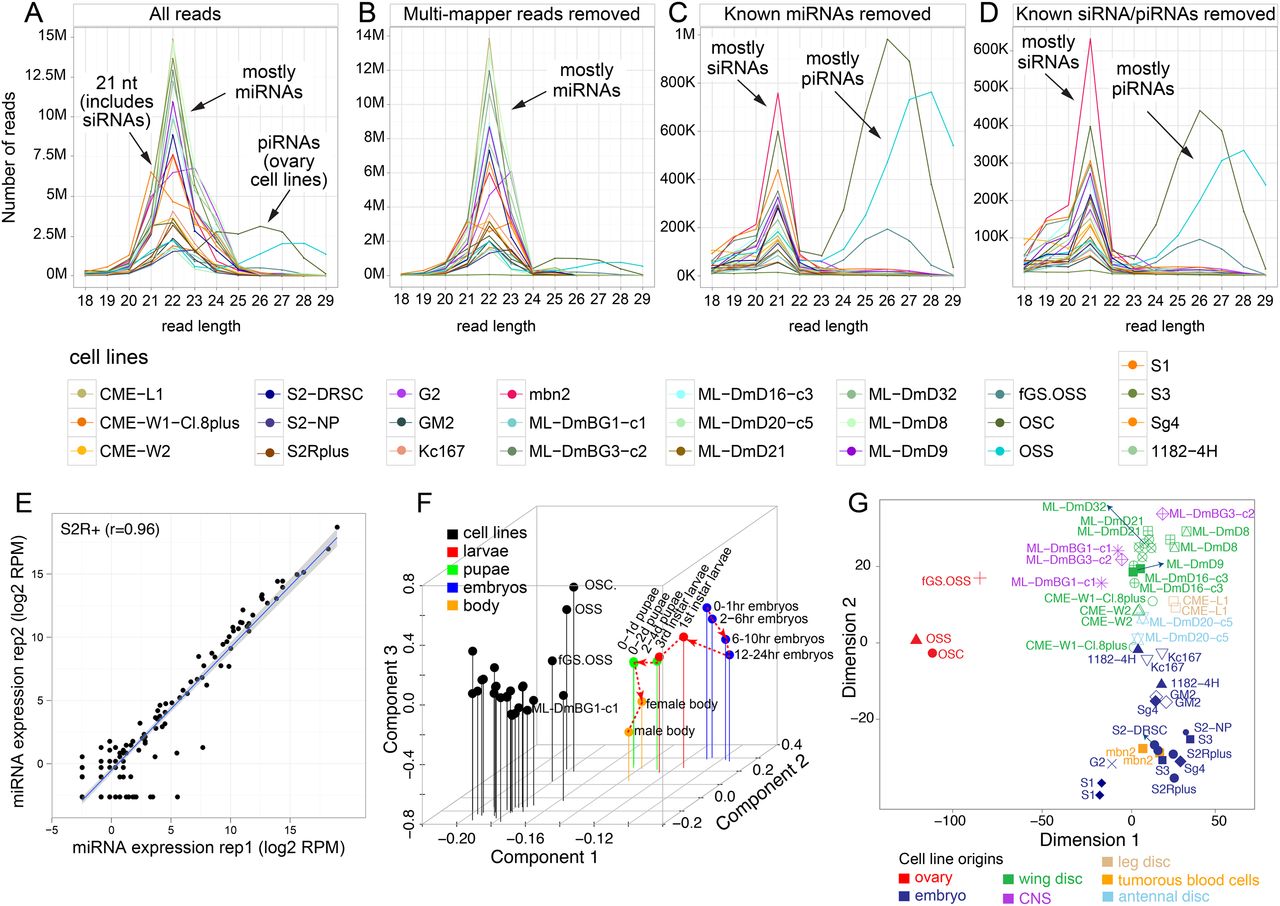 Size distributions of small RNA reads across the 25 Drosophila cell lines. Shown are the distributions of all mapped reads (A) and following sequential removal of multimapper reads (B), of reads from known miRNA loci (C), of reads from known endo-siRNA loci (of the 3′-cis-NAT and hpRNA classes) and of known 3′ UTR piRNA loci (D). Annotated small RNA classes exhibit characteristic preferred sizes, namely, ∼21-nt siRNAs, 22-nt dominant miRNAs, and ∼24- to 29-nt piRNAs. This analysis highlights that an abundance of uniquely mapping, novel siRNA and piRNA reads remains after accounting for all previously annotated Drosophila small RNAs. The color guides for the different cell lines are shown below, and all replicate data were combined for this analysis. The piRNAs were mainly expressed by the ovary-derived cell lines fGS/OSS, OSS, and OSC. (E) Biological replicates of S2R+ small RNAs showed high correlation (r = 0.97). All cell line replicates were well correlated (r > 0.89) (see also Supplemental Fig. S1). (F) Principal component analysis based on sRNA (miRNAs, TE-siRNAs, TE-piRNAs, and piRNA master clusters) expression clearly separates all cell lines from data sets acquired from across a developmental time course. (G) Multidimensional scaling based on sRNAs shows that cell line replicates are generally grouped together, and cell lines from the same tissue origins are generally well grouped together.