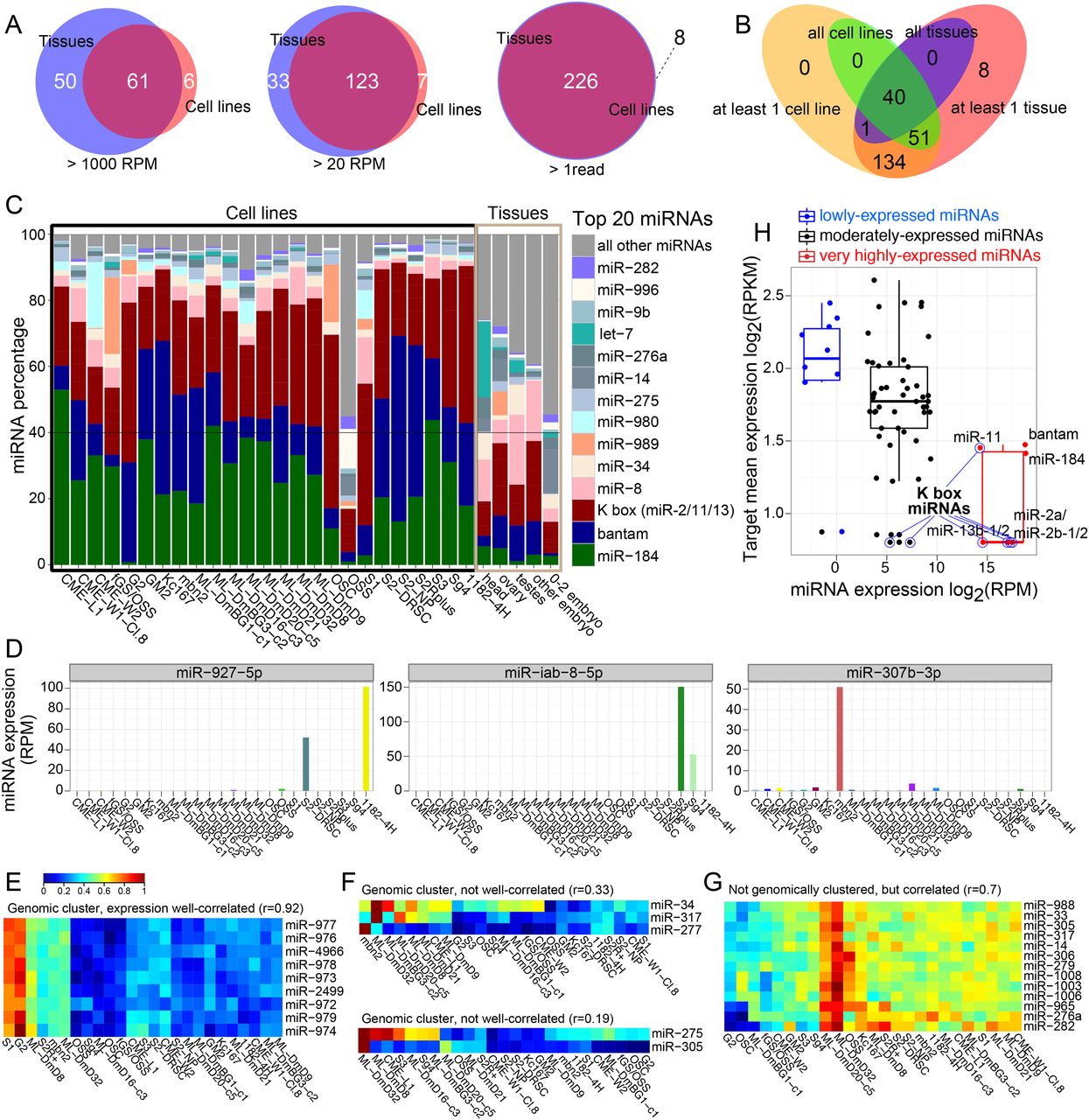Properties of miRNA expression across cell lines. (A) Overlaps between miRNA expression across the aggregated cell line and tissue data sets, at different thresholds of miRNA expression in at least one tissue or cell line, respectively. (B) Summary of overlap of miRNAs (≥1 read) between cell lines and tissues. (C) Percentage distribution of the top 20 expressed miRNAs in individual cell line and tissue data sets (normalized by total miRNA reads). (D) Examples of cell-specific singletons, i.e., expressed in a few cell lines and miRNAs. (E) Example of a highly cell-specific miRNA cluster. All the members of the mir-972→979 cluster are specifically coexpressed in S1 and G2 cells. (F) Examples of genomic miRNA clusters, whose members exhibit disparate expression patterns across different cell lines. (G) A cluster of genomically separate miRNAs that exhibits largely correlated expression patterns across different cell lines. (H) Global anti-correlation of miRNAs and their targets. Target expression (RPKM) for targets of the highly expressed miRs (miR-184/bantam/K box miRNAs), 40th–60th percentile moderately expressed miRNAs, and the lowest 20th percentile miRNAs.
