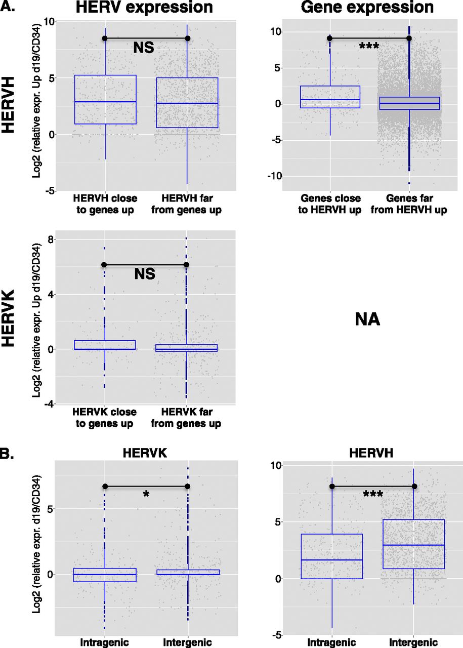 Up-regulation of ERE-close genes during reprogramming. (A) Using a twofold change cutoff and an adjusted P-value of <0.05, 3703 genes were found up-regulated in CD34+ cells at day 19 post-OKS transduction, compared with untransduced cells. (Left) Relative expression of HERVH (top) or HERVK (bottom) integrants situated close (<40 kb) or far (>80 kb) from these genes. No significant difference was detected (Wilcoxon test P = 0.14 for HERVK, 0.11 for HERVH). (Right) Reverse analysis, revealing that HERVH-close transcripts (n = 365 genes, or 695 transcripts) were more likely to be up-regulated than HERVH-distant transcripts (n = 18145 genes, or 30,053 transcripts). (NA) Not available due to insufficient numbers. (B) Expression levels of intragenic vs. intergenic HERVHs or HERVKs at d19 of CD34+ cells reprogramming showing no bias toward intragenic HERVs. In fact, the reverse trend was observed, with more intergenic than intragenic HERVs up-regulated at d19 of reprogramming.