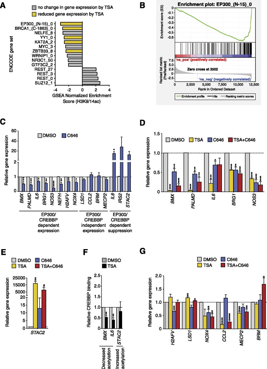 Loss of EP300/CREBBP HATs at gene promoters is associated with histone deacetylation. (A) GSEA identifies changes in transcription factor binding at deacetylated gene promoters using the ENCODE ChIP-seq collection of various transcription and coregulatory factors and chromatin-associated proteins (TFBS). A negative normalized enrichment score (NES) shows deacetylated gene sets, while a positive NES score indicates gene sets associated with histone acetylation. All gene sets are NOM P-value < 0.05 and FDR Q-value < 0.05 according to the standard GSEA output. Yellow bars indicate corresponding changes in gene expression of the DNA or chromatin-bound factors in TSA-stimulated HAECs (adjusted P < 0.05). Numbers following the protein name represent the cell line and have been defined in the Supplemental Methods. (B) GSEA plot showing an association of EP300-bound genes associated with histone deacetylation in response to TSA. Genes are ranked by changes in H3K9/14ac. (C) Gene expression changes of HAECs exposed to the C646 EP300/CREBBP inhibitor compared to DMSO control, determined by qRT-PCR. Genes are divided into three groups based on EP300/CREBBP-dependent regulation. The first group comprises expressed genes dependent on EP300/CREBBP; the second group is EP300/CREBBP-independent genes; and the third group is suppressed genes dependent on EP300/CREBBP. All data, n = 4, except for IL8 and IRS2, n = 3. (D,E) qRT-PCR was performed in TSA-stimulated HAECs (500 nM, 12 h), C646 (20 μM, 15 h), and a combination of both C646 and TSA (C646: 20 μM, 15 h; TSA: 500 nM, 12 h). All changes in expression (TSA, C646, TSA + C646) are relative to the DMSO control. Gene expression was determined by normalizing against HPRT1. TSA-stimulated changes in gene expression are shown for genes with promoters associated with decreased (D) and increased (E) histone acetylation. (F) ChIP analysis was performed using anti-CREBBP antibody in TSA-stimulated HAECs (TSA: 500 nM for 12 h). (G) TSA-dependent changes in gene expression regulated by the C646 EP300/CREBBP inhibitor. Error bars represent SEM. For DMSO-, TSA-, and C646-treated cells, n = 4. For TSA + C646 treated cells, n = 3. For CREBBP ChIP, n = 3. (*) P < 0.05, (**) P < 0.005, (***) P < 0.0005, (****) P < 0.0001, (#) P < 0.06, unpaired t-test.