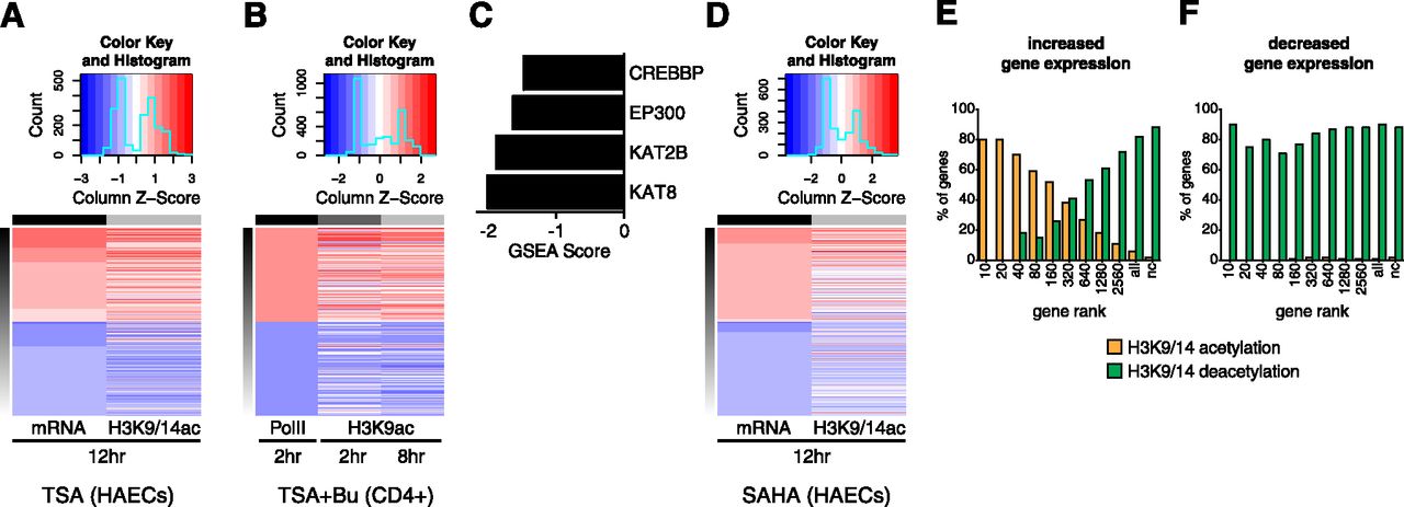 Genome-wide deacetylation using HDAC inhibitors. (A) Heat map showing gene expression (adjusted P < 0.05) and corresponding histone acetylation changes. HAECs were stimulated with 500 nM TSA for 12 h, and the corresponding changes in H3K9/14ac (ChIP-seq) at the promoter region were intersected with gene expression (mRNA-seq). (Red) Increases in gene expression and histone acetylation; (blue) corresponding decreases. (B) Heat map of changes in gene expression, based on Pol II ChIP-seq, in CD4+ T-cells stimulated with 100 ng/mL TSA and 2 mM sodium butyrate for 2 h, and corresponding changes in H3K9ac (at 2 and 8 h). Data derived from GEO (Series ID: GSE15735). (C) Normalized enrichment scores derived from GSEA showing the association of HATs in native CD4+ T-cells (determined by ChIP-seq) and changes in acetylation following 8 h stimulation with 100 ng/mL TSA and 2 mM sodium butyrate. (D) Heat map showing changes in gene expression (adjusted P < 0.05) in SAHA-stimulated HAECs (2 μM, 12 h) and corresponding changes in H3K9/14ac at gene promoters. (E,F) Gene expression changes are associated with H3K9/14ac modification in SAHA-stimulated HAECs. Genes were ranked based on expression derived from mRNA-seq analysis. (For example, the top “10” genes are shown followed by the top “20” genes and so on [adjusted P < 0.05].) The largest category represents “all” genes and “nc” refers to no change in gene expression.