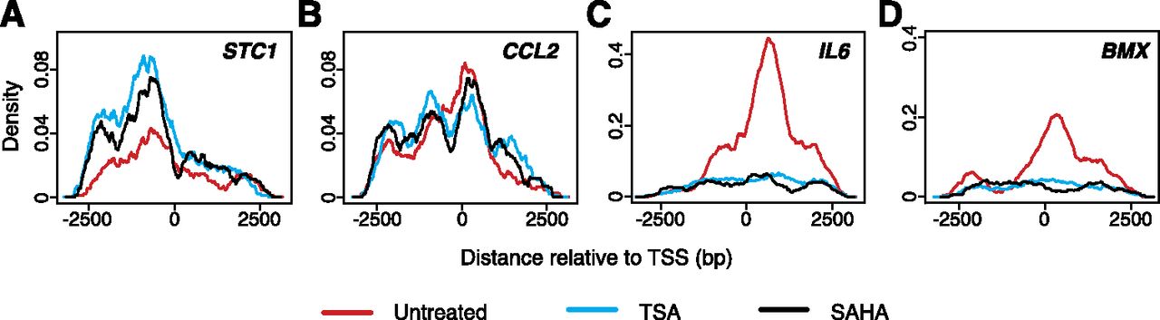 HDAC inhibition by SAHA and TSA. H3K9/14ac at promoters of genes implicated in vascular endothelial function in response to TSA and SAHA stimulation are shown. (A) Increased STC1 gene expression was associated with promoter acetylation. (B) Reduced CCL2 gene expression was not associated with changes in histone acetylation. Reduced IL6 (C) and BMX (D) gene expression were associated with histone deacetylation. H3K9/14ac profiles shown are representative of three independent experiments. Kernel density estimation bandwidth: 200.