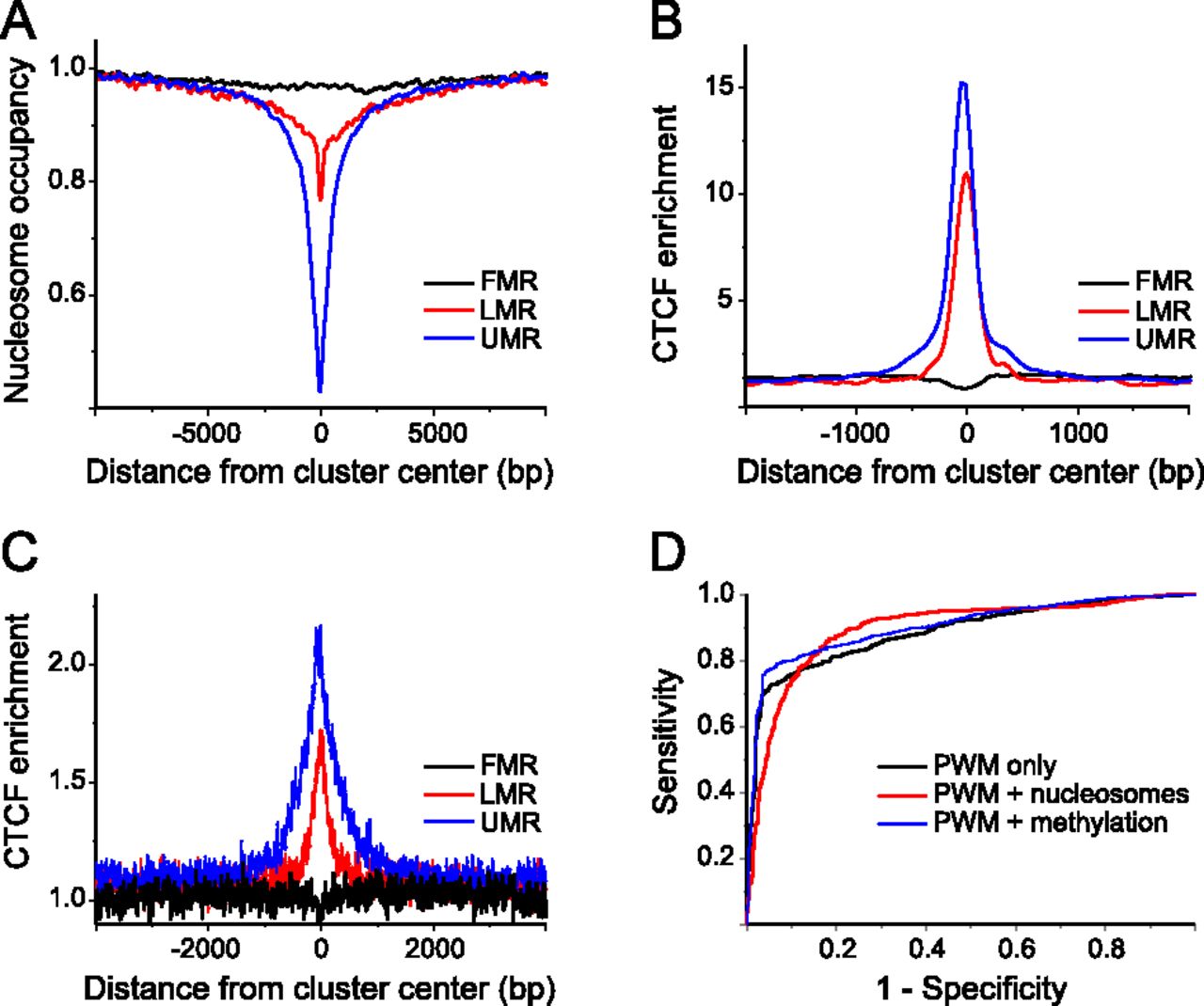 CTCF binding in ESCs can be explained solely by the DNA sequence. (A) Average nucleosome occupancy profiles for genomic regions with different levels of DNA methylation. For fully methylated regions (FMR), the occupancy remains flat as compared to genome-average levels. Low methylated regions (LMR) and unmethylated regions (UMR) were nucleosome-depleted by ∼30% and ∼60%, respectively. (B) Average CTCF enrichment calculated from ChIP-seq data for the three different classes of 5mC density. (C) Average CTCF enrichment predicted for the same regions based on the DNA sequence preferences given by the TRANSFAC PWM, without taking into account nucleosomes and DNA methylation. (D) Receiver operator curves calculated for the TFnuc model, taking into account only the CTCF weight matrix without nucleosomes and DNA methylation (black). In addition to PWM, competition with nucleosomes (red) or DNA methylation (blue) was considered. The area under the curve (AUC) reflects both the sensitivity and specificity and thus determines the goodness of the model.