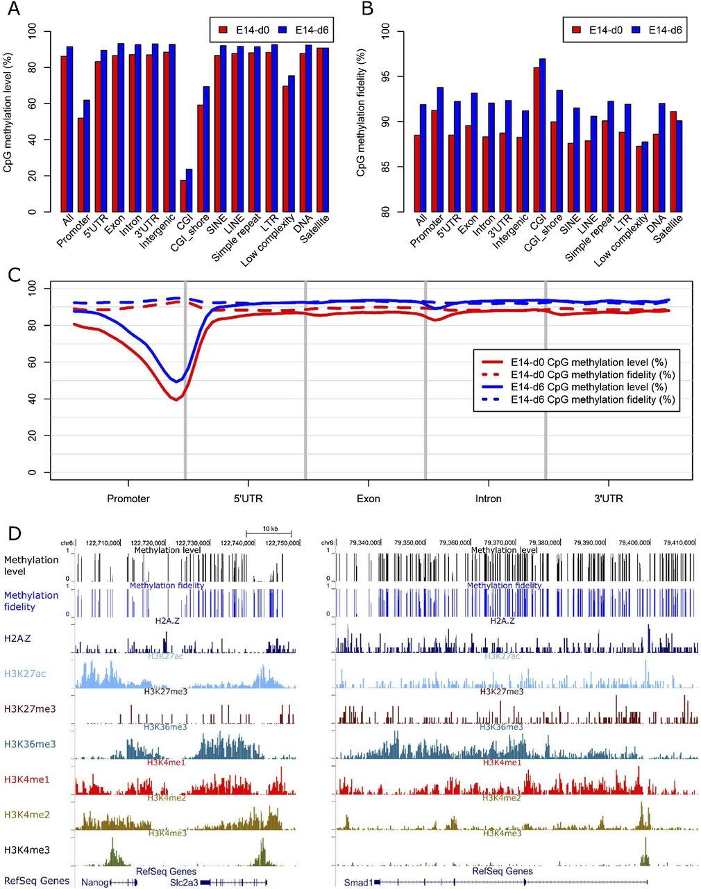 Characteristics of DNA methylation level and fidelity for CpG dyads at different genomic regions. (A,B) Bar plots showing the methylation level (A) and fidelity (B) of CpG dyads at different genomic regions. (C) CpG methylation level and fidelity along different gene-associated regions. The smoothed lines represent the mean methylation level (solid lines) and fidelity (dashed lines). (D) Genome browser representation of methylation level, methylation fidelity, and various histone modifications at genes including Nanog, Slc2a3, and Smad1.