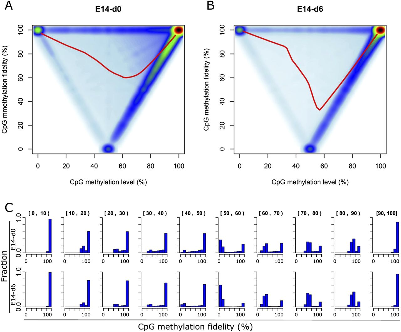 CpG methylation fidelity follows a bimodal distribution. (A,B) Scatter plots showing the relationship between methylation level and methylation fidelity in E14-d0 (A) and E14-d6 (B). The smoothed lines represent the mean methylation fidelity along the change of methylation level. (C) Histograms showing the distribution of methylation fidelity for CpG sites with methylation levels at 10 intervals in E14-d0 and E14-d6, respectively. The methylation level intervals are indicated in brackets on the top of each subplot.