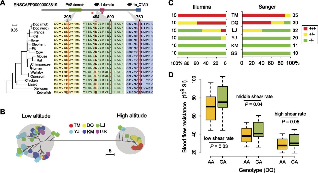 EPAS1 mutations in the coding region. (A) Structural and evolutionary analysis of the four amino acid variants. The protein coordinate is based on Ensembl ID ENSCAFP00000003819. The coordinate of NCBI RefSeq XP_531807.2 is slightly different but the variants remain the same. The upper panel shows the Pfam domains of the protein. The orthologous protein sequences from 17 vertebrates are aligned with the mutant residues shown in red. The NJ tree derived from the multiple alignment is shown in the left panel. The red stars indicate two hydroxylation sites (Pro405 and Pro531), which are essential for oxygen sensing (Patel and Simon 2008). (PAS) Per-Arnt-Sim; (HIF) hypoxia-inducible factor; (CTAD) C-terminal transactivation domain. (B) NJ tree of the 8-kb haplotypes comprising the four nonsynonymous mutations. The evolutionary distance is defined as the number of different nucleotides between haplotypes. The haplotypes from high- and low-altitude breeds were grouped into two distinct clades. (C) Percentages of homozygotes and heterozygotes in the six breeds. The mutant and reference alleles are represented by “+” and “−”, respectively. Besides the 60 dogs sequenced with the Illumina technology, additional samples were genotyped with Sanger sequencing. The sample size is shown beside the bars. (D) Association between EPAS1 genotypes (mutant allele, A; reference allele, G) and blood flow resistance in DQ. The blood flow resistance was measured at different shear rates. In the boxplot, the line within the box defines the median; the ends of the boxes define the 25th and 75th percentiles; and the error bars define the 10th and 90th percentiles. The ANOVA F-test was performed, taking the age as covariant.