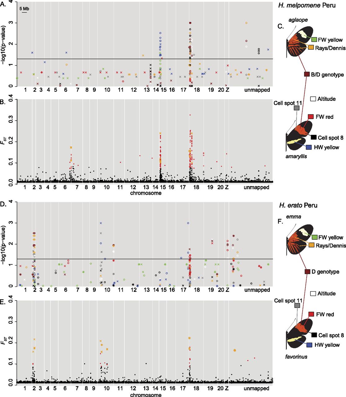 Association mapping (A,D) and outlier analysis (B,E) for H. melpomene (A–C) and H. erato (D–F) in Peru. Each phenotype used for the association mapping is shown in a different color as illustrated in C and F. For clarity, only the top 20 associated SNPs are shown for each phenotype. The outlier analysis results show FST values for all SNPs, with significant outliers shown in red. Results from the de novo assembled data are shown as crosses (and in orange for the outlier analysis) and positioned based on the top BLAST hit to the H. melpomene genome; those that were not confidently or uniquely assigned to these positions are shown as stars (e.g., those at the end of chromosome 10 in D). (Unmapped) Scaffolds of the H. melpomene reference genome that were not assigned to chromosomes in v1.1 of the genome assembly.