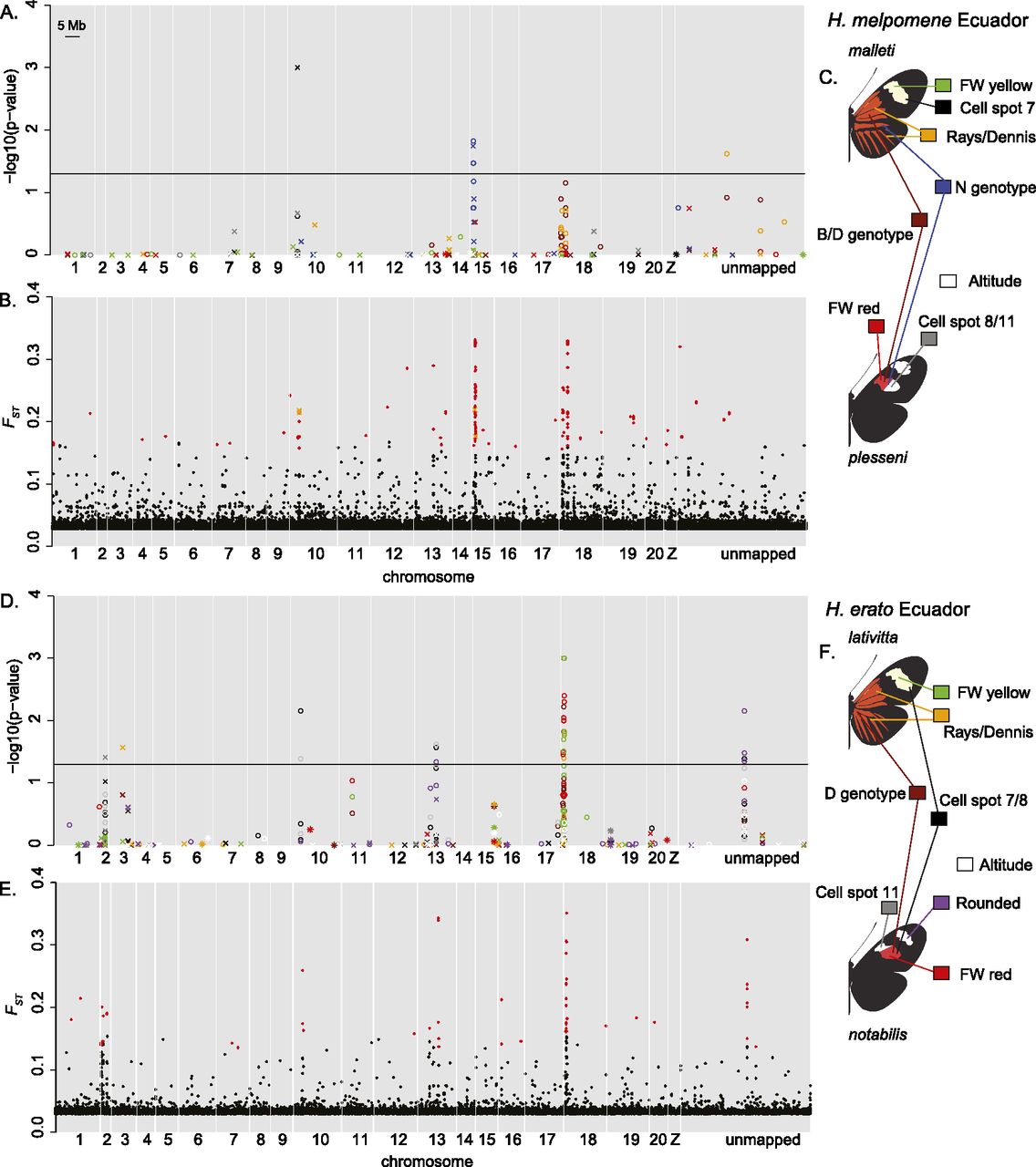 Association mapping (A,D) and outlier analysis (B,E) for H. melpomene (A–C) and H. erato (D–F) in Ecuador. See Figure 3 legend for further information.