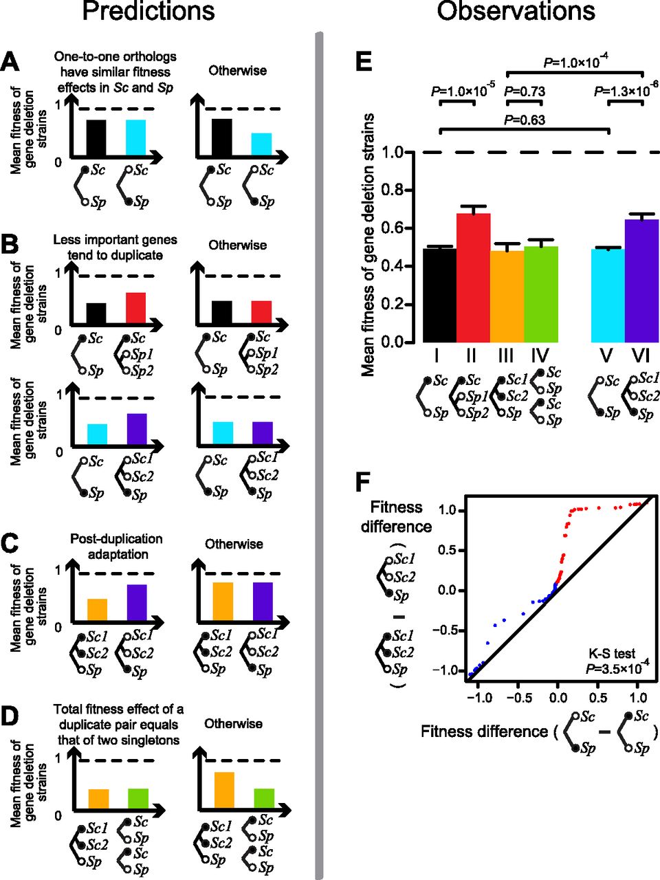 Predicted and observed fitness values of various gene deletion strains of S. cerevisiae (Sc) and S. pombe (Sp). (A–D) Predicted fitness values based on various hypotheses. (E,F) Observed fitness values. In all panels, one-to-one, two-to-one, and one-to-two orthologs between Sc and Sp are indicated by gene trees. A solid circle indicates the deleted gene(s) in the strain whose fitness is presented. The dashed line shows the corresponding wild-type fitness. (A) Expected fitness relationships when deleting one-to-one orthologs in Sc and Sp have similar fitness effects (left) and when they have different effects (right). (B) Expected fitness relationships when less important genes tend to duplicate (left) and when gene importance does not impact the probability of gene duplication (right). (C) The expected fitness relationship when gene duplication facilitates adaptation (left) and when it does not promote adaptation (right). (D) The expected fitness relationship under the theoretically maximal fitness gain after gene duplication (left) and that under a smaller fitness gain (right). (E) Observed mean fitness values of various gene deletion strains. The six columns contain 1620, 135, 156, 156, 1620, and 253 genes or gene pairs (left to right). There are fewer gene pairs in bar III compared with bar VI because the fitness values of some double deletion strains are unavailable. Error bars show one standard error and P-values are from Mann-Whitney U tests. (F) Quantile–quantile plot of fitness gains in Sc, relative to Sp. The x-axis shows the quantiles of the fitness difference between Sp and Sc strains lacking one-to-one orthologs, whereas the y-axis shows the corresponding quantiles of the fitness difference between Sp and Sc strains lacking two-to-one orthologs. Each dot represents a two-to-one orthologous trio (y-axis) and the corresponding one-to-one orthologous pair (x-axis) that has the closest quantile to the two-to-one trio. Red dots are duplicates with fitness gains (DWFG), whereas blue dots are duplicates without fitness gains (DWOFG).