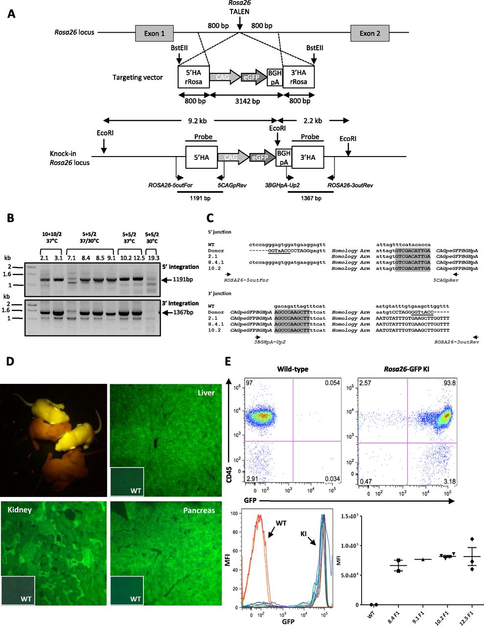 Targeted integration of a GFP cassette into the Rosa26 locus. (A) (Upper) Diagram showing schematic representation of the rat Rosa26 locus, with the site of TALE nuclease action (vertical arrows) and of the targeting vector with the expression cassette (3142 bp) and the 5′ and 3′ homology arms (800 bp each). The homology arms are contiguous to the TALE nucleases’ cleavage point. BstEII restriction sites are indicated. (A) (Lower) Diagram showing schematic representation of the GFP cassette integration. For PCR in/out analysis, genomic DNAs were PCR-amplified with primers situated for the 5′ side: upstream of the 5′ HA arm (ROSA26-5outFor) and in the CAG promoter (5CAGpRev); and for the 3′ side: in the BGHpA (3BGHpA-Up2) and downstream from the 3′ HA arm (ROSA26-3out Rev). The position of each primer and the corresponding expected size of PCR products are indicated on the schematic knock-in Rosa26 locus. For Southern blot analysis, genomic DNA was digested with EcoRI and was probed with the homology arms’ probe for Rosa26. Two bands at 9.2 kb and 2.2 kb are predicted for a correct HDR into the Rosa26 locus. (B) Flanking PCR analysis. Gels show the results analyzing the 5′ and the 3′ extremities of the expression cassette integration into the Rosa26 locus. A representative panel of nine founders is illustrated, showing expected bands of 1191 bp using the first pair of primers (ROSA26-5outFor + 5CAGpRev), and of 1367 bp using the second pair of primers (3BGHpA-Up2 + ROSA26-3outRev). The microinjection conditions in terms of mRNA and DNA concentrations as well as embryo incubation temperatures are above each animal. (C) Sequence comparison at the 5′ and 3′ junctions with wild-type genomic DNA and donor DNA sequences of two representative founders (2.1 and 10.2) and one representative F1 (8.4.1: offspring of founder 8.4). In donor DNA, the presence of the BstEII site is indicated (underlined). The start and the end of the expression cassette are colored in gray. (D) Two representative 8-d-old Rosa26 HDR rat pups (F1s of founder 8.4) and two wild-type littermates. GFP expression in adult tissues (liver, kidney, pancreas) of a Rosa26 HDR rat. Insets show tissues obtained from littermates negative for GFP PCR (wild type, WT). Magnification: ×100. (E) GFP expression in leukocytes from different lines of Rosa26 HDR rats. FACS analysis of GFP expression in CD45+ leukocytes isolated from peripheral blood from four different lines of Rosa26 HDR adult rats (F1generation) and a wild-type littermate. (Upper) FACS patterns obtained from two F1 (an HDR GFP+ and a negative littermate) of founder 8.4. (Lower) Analysis of the level of GFP expression in the peripheral blood of offspring of four Rosa26 HDR founders using the mean fluorescence intensity of leukocytes. Each point represents one animal and the horizontal bars the mean and standard deviations.