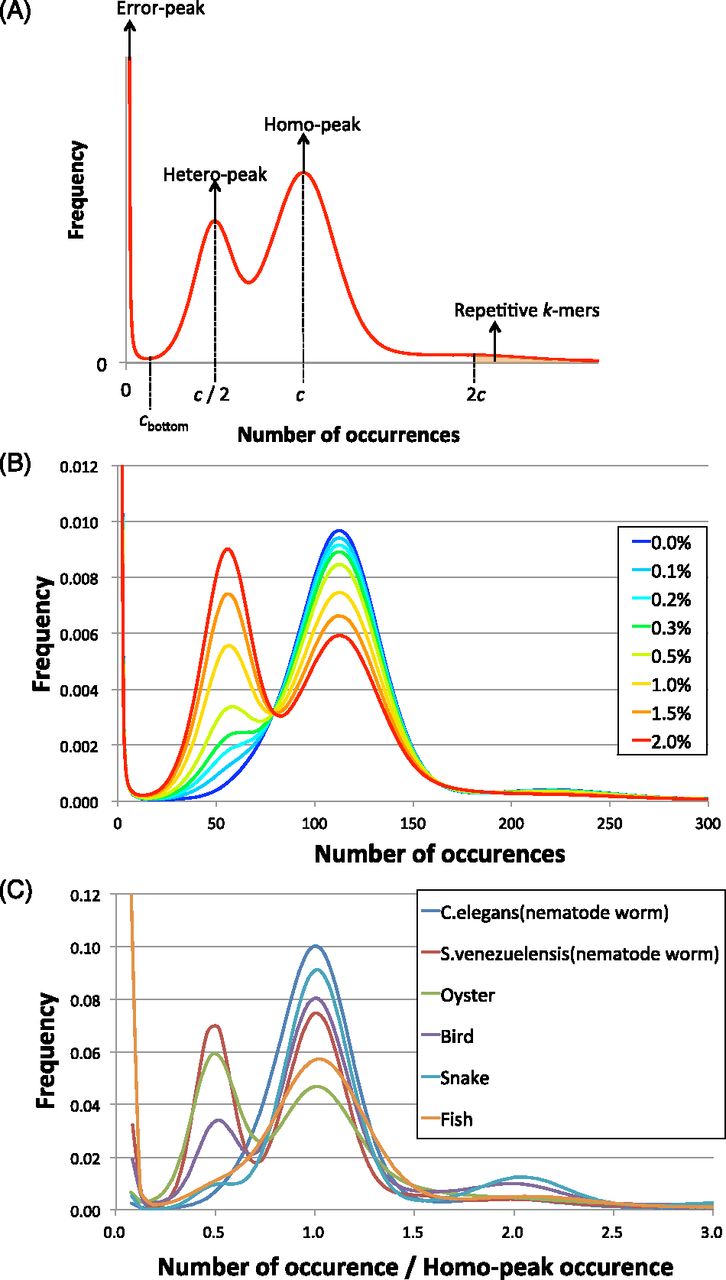 Distribution of the number of 17-mer occurrences. (A) Schematic model of the distribution of k-mer occurrences. This distribution is related to that shown in Table 1. (B) Simulated heterozygous data from C. elegans. (C) Distributions of normalized 17-mer occurrences for all species.