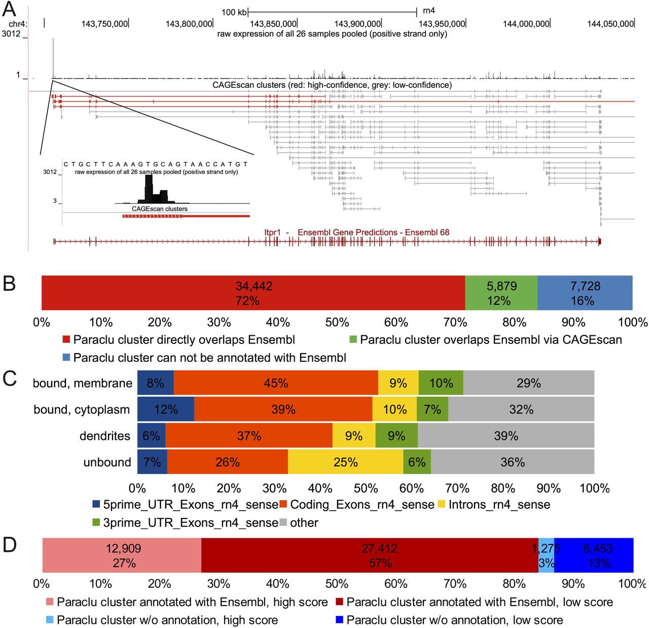 (A) Genomic representation of the PC marker Itpr1. Below the chromosomal coordinates are shown the following: (top) quantitative representation of CAGE tag abundance on the positive strand and (bottom) Paraclu followed by CAGEscan clustering groups tag into clusters (here color-coded according to the cluster’s classification score). (B) Paraclu clusters annotated with an Ensembl gene by direct overlap or via CAGEscan. (C) Percentages of the first 5′ nucleotide sequences that fall into 5′ untranslated regions, exons, introns, and 3′ untranslated regions of Ensembl genes (downloaded March 28, 2012). (D) Promoter classification.