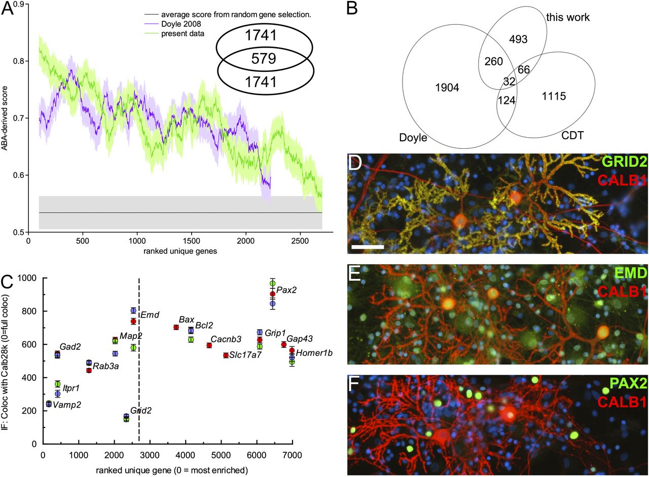 (A) Comparison of capture selectivity against a published data set and against noise. (X-axis) 200 points moving window (±SEM) averaging the ABA scores for our data set and that of Doyle et al. (2008), ranked by P-value. Noise was estimated from similar scoring of randomly selected rat genes. (Inset) Number of gene symbols unique or common to the 2320 first clusters plotted in this graph for each data set. (B) Venn diagram of the number of gene symbols unique or common to the sets of Purkinje-specific genes defined by this work, the experiment of Doyle et al. (2008) and the CDT-DB. The gene symbols can be found in Supplemental Table S4. (C) Comparison of transcript enrichment in PCs to the relative distribution of selected proteins, detected by immunofluoescence, in vitro. Anti-calbindin D28k (Alexa546) images were thresholded to define PC regions of interest. For all tested proteins, median fluorescence intensity in the non-PC area was expressed relative to intensity in PCs (with zero indicating exclusive expression by PCs). Measurements belonging to the same replicate are coded in the same color (red, green, blue). Note that Grid2 (DELTA2R) appears here as an outlier because its most intense 5′ UTR cluster (rank, 129; LogCPM, 3.35) was not recognized as a promoter-binding region. (D–F) Representative micrographs for GRID2 (D), emerin (E), and PAX2 (F), all costained with anti-calbindin (red) and DAPI (blue). Scale bar, 50 µm.