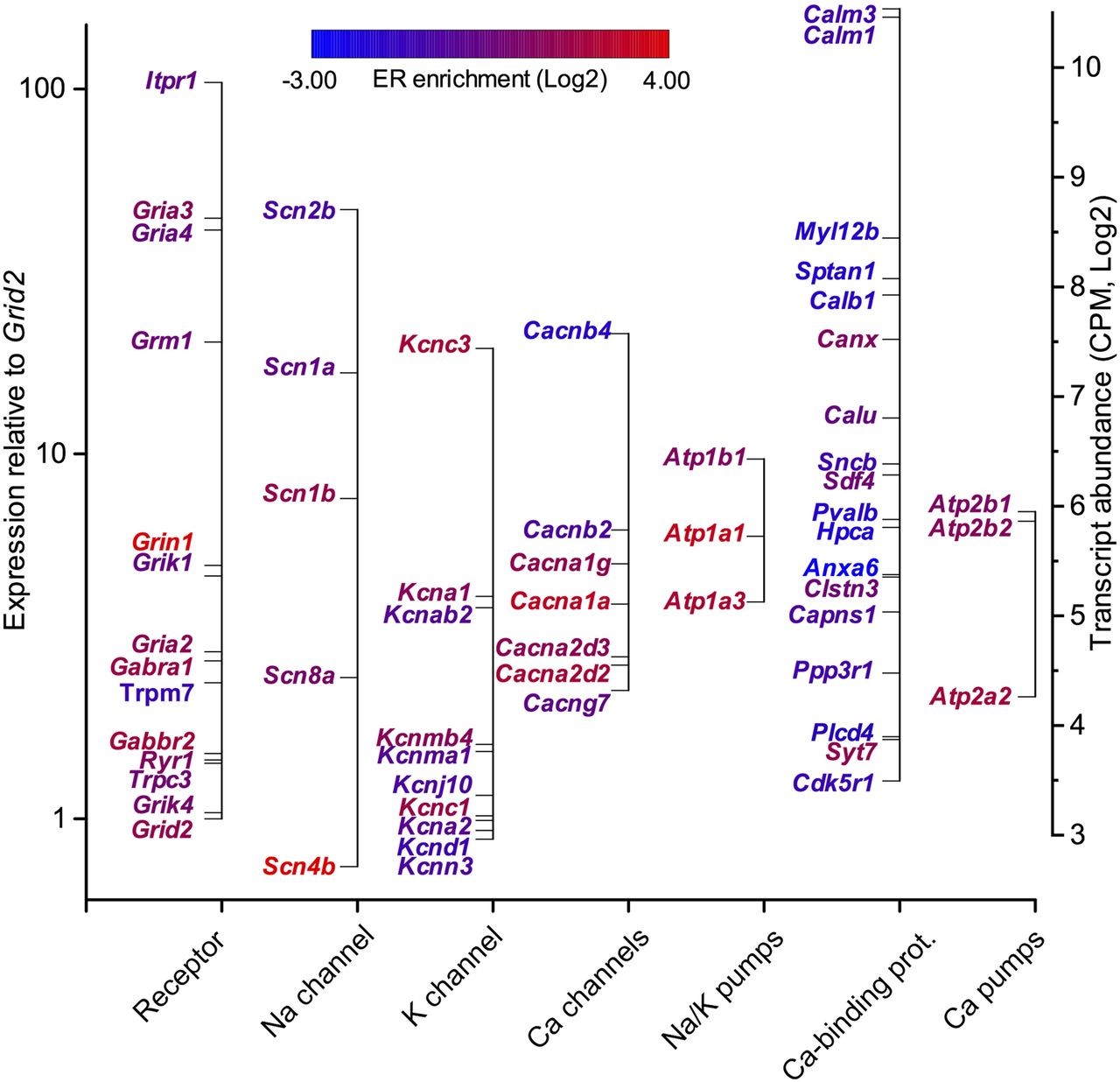 Relative expression of biophysically relevant transcripts coding for receptors, Na+, K+, and Ca++ channels, ion pumps, and Ca++-binding proteins. Expression levels are expressed relative to other transcripts in the library (right axis) and relative to the Grid2 transcript coding for the PC synapse-specific glutamate receptor, ionotropic delta 2. Gene names are color-coded according to the differential expression between cytoplasm and ER fractions.