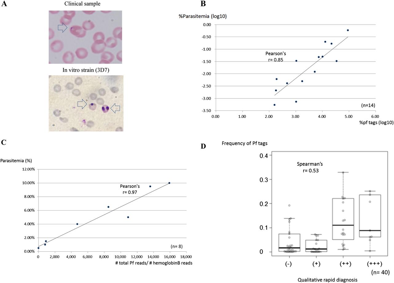 Associations of RNA-seq read counts and clinical information of parasitemia. (A) Representative image of a thin blood film from a clinical sample (top) and 3D7 (bottom) from which infected red blood cells were counted and parasitemia was calculated. Arrow indicates the stained parasite. (B) Relation between the Pf read counts and the parasitemia, which was diagnosed by a microscopic view of the thin blood film (n = 14). Numbers of infected red blood cells were counted microscopically. (C) Results of a similar analysis from an in vitro cultured Pf strain, 3D7. Parasites were cultured at the indicated parasitemia, which was validated microscopically and used for the RNA-seq analysis, as in the case in the clinical samples (n = 8). Pf tag counts were normalized with those of the human beta globin gene. (D) Qualitative comparison between clinical parasitemia and Pf read counts (n = 40). For this analysis, parasitemia was qualitatively determined by rapid diagnosis according to the standard protocol. The correlation coefficient calculated by the indicated methods is shown in the respective graphs.