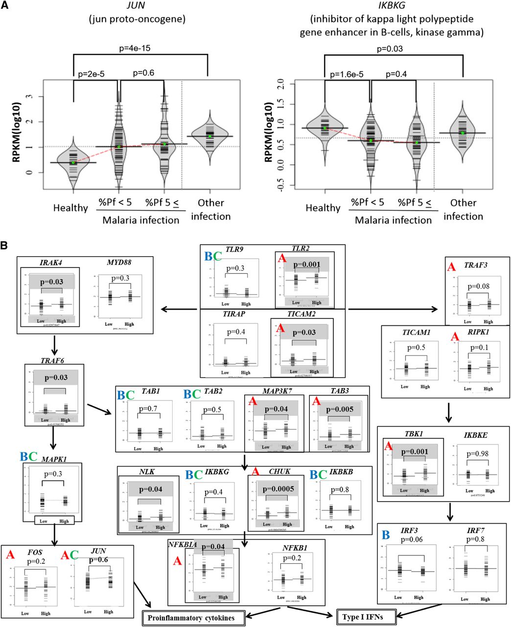 Gene expression patterns of the TLR4 pathway genes. (A) Examples of the gene expression patterns between healthy controls, malaria patients with %Pf tags of <5%, >5%, and patients with other infectious diseases. Left and right panels exemplify the cases where gene expression levels increased with increasing %Pf tags (the case of the JUN gene) and where they decreased (the case of the IKBKG), respectively. Also note that left and right panels exemplify the cases where the observed difference was malaria-specific and nonmalaria-specific, respectively, which was revealed by considering the control patients with other infectious diseases. Statistical significances in the differences were evaluated by Wilcoxon signed rank test and are shown in the margins. (B) Global patterns of gene expression in the TLR4 pathway. Significant differences between two populations (%Pf tags of >5% or <5%) are shown above the plots. Genes significantly up-regulated in the patients with high %Pf tags (P < 0.05) are enclosed in bold boxes. Also, by considering the controls (healthy controls and patients with other infectious diseases), “A” and “B” indicate genes where the increase and decrease in the gene expressions were observed for the increasing or decreasing %Pf tags, respectively, and such differences were statistically significant against healthy controls. Among them, “C” indicates the cases where the gene expression differences were significant against the control patients with other infectious diseases, thus, the difference appeared to be malaria-specific. For evaluating statistical significance in the differences, Wilcoxon signed rank test was used.