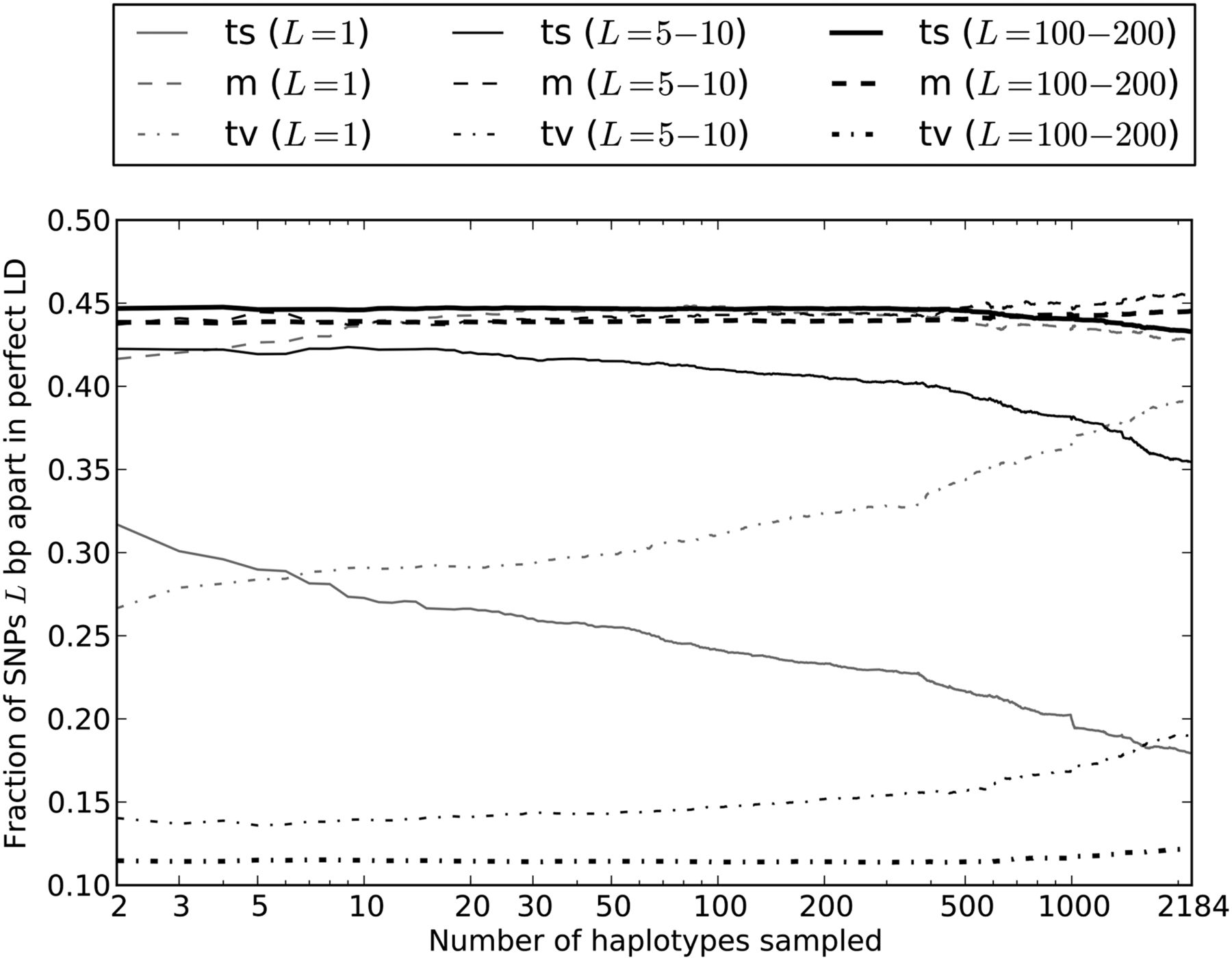 Enrichment of transversion pairs and MNMs with increasing sample size. We generated subsamples of the 1000 Genomes data containing 2–2184 haplotypes and computed the percentages of transversion pairs, transition pairs, and mixed pairs for perfect LD SNPs in each data set. As the number of sampled haplotypes increases, the percentage of perfect LD SNPs that are MNMs should increase, leading to an increase in the frequency of transversions and a decrease in the frequency of transitions. This effect is most apparent when the SNPs are adjacent (1 bp apart) or very close (5–10 bp apart). However, perfect LD SNPs that lie 100–200 bp apart display the same pattern, indicating that MNMs spanning 100–200 bp are much less common but are still evident in samples of many lineages.