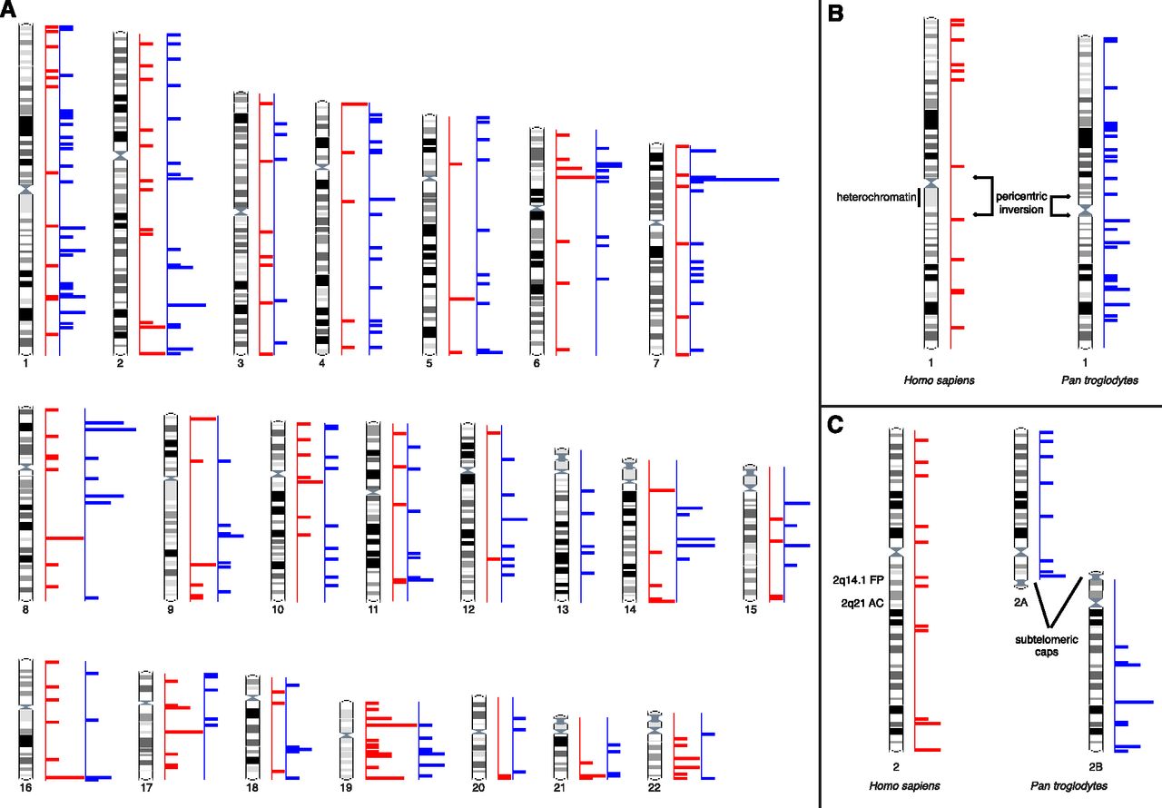 (A) Human karyotype-wide mapping of the regions with human-specific (n = 164, red) and chimpanzee-specific (n = 224, blue) enrichment of H3K4me3 modifications in LCLs. Chimpanzee-specific regions in panel A are positioned on the human karyotype; however, some chromosomes are structurally different between these species. For example, chromosome 1 differs because of a pericentric inversion and heterochromatin content (B); chromosome 2 differs because of a chromosomal fusion in human and the presence of subtelomeric heterochromatic caps (C).